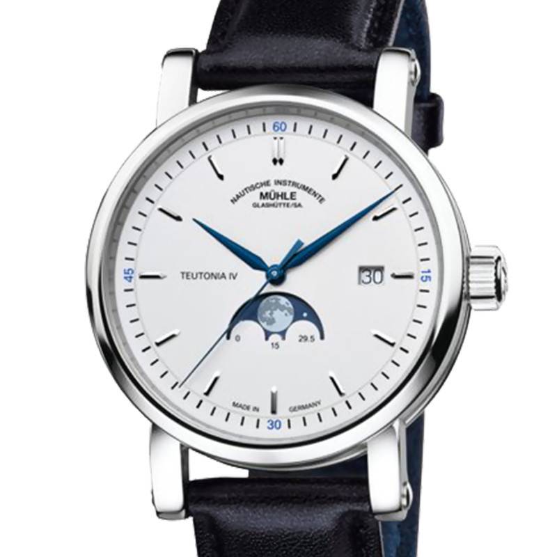 La maison familiale Mühle-Glashütte est connue pour ses montres de haute qualité, sa passion pour la précision et un haut degré d'artisanat manuel. Un grand nombre d'heures de fabrication et de nombreuses étapes de travail vous offriront des modèles uniques, fiables avec une lisibilité optimale. Mühle vous propose le nouveau modèle Teutonia IV qui fascinera les fans de l'univers lunaire. Classique, ce garde-temps est composé d'un boîtier en acier inoxydable poli et dispose d'un diamètre de 41 mm et d'une épaisseur de 12,6 mm. Cette montre aux dimensions masculines s'ajustera parfaitement sur votre poignet. Vous retrouverez un verre saphir bombé qui surplombera le boîtier. Grâce à son traitement anti-reflet vous ne serez pas perturbé pour lire l'heure et votre montre sera protégée des rayures et des chocs. Par ailleurs, vous noterez que le fond de boîte est vissé, mais aussi transparent. Sa transparence vous donnera une vision du travail réalisé autour du mouvement. Enfin, la couronne située à trois heures vous permettra de régler les heures et les minutes à votre convenance.