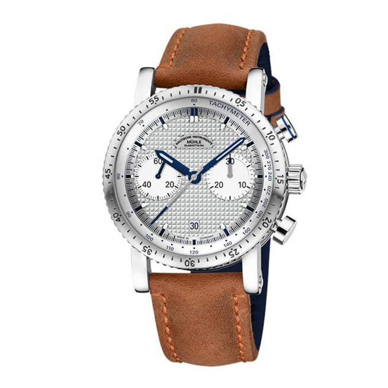 Mühle Glashütte, c'est d'abord l'histoire d'une maison passionnée et soucieuse de fournir des montres de qualité à la beauté exceptionnelle. Elle vous présente ce fabuleux garde-temps Teutonia Sport I Chronographe inspiré par les voitures de courses des circuits allemands. Cette montre qui plaira aux amateurs d'automobiles offrira une grande élégance à votre poignet et une précision à toute épreuve. Elle dispose d'un boîtier en acier inoxydable brossé et poli affichant un diamètre de 42.6mm pour une épaisseur de 15.5mm, des dimensions idéales pour un poignet masculin. Afin d'assurer sa protection, le cadran s'équipe d'un verre Saphir bombé antireflet connu pour sa résistance incroyable face aux chocs et autres rayures du quotidien. Ce modèle dispose d'une couronne crantée vissée qui vous servira à régler l'heure et sera entouré de deux boutons poussoirs se logeant à deux et quatre heures. Enfin, son fond de boîte transparent maintenu par des vis vous donne l'opportunité d'admirer sa masse oscillante. Veuillez noter que son étanchéité est de 10 atmosphères.