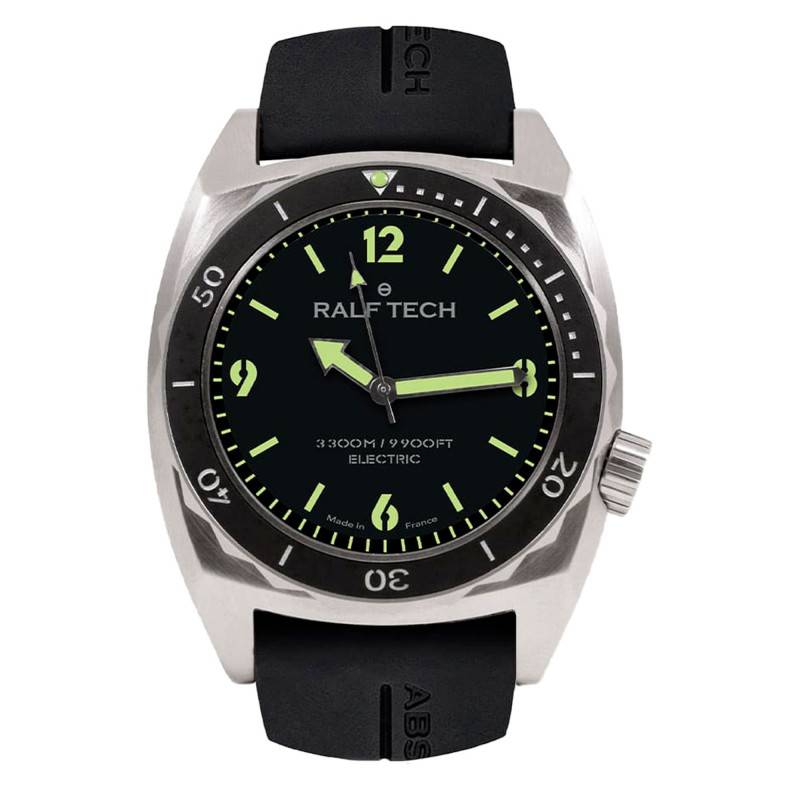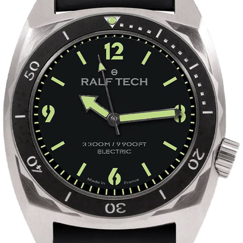 Ralf Tech est une entreprise qui proposait des matériaux de plongée depuis 1996. En 2008, elle s'oriente vers l'horlogerie en créant des modèles inédits, techniquement aboutis, à la fois précis, fiables et robustes. La marque française inaugure le modèle The Beast Electric "Original" TBE 5001 qui rappelle l'univers marin et celui de la plongée sous-marine, et qui dispose d'une importante étanchéité. Cette ravissante montre arbore un boîtier tonneau avec des lignes angulaires et une finition satinée. Proposé avec un diamètre de 47,70 mm et conçu en acier chirurgical 316L, il se pare d'une lunette unidirectionnelle à 120 clics. Crantée, elle présente un aspect « Diamond Shape » et dispose d'un insert en céramique mat (Ceramfine®) de couleur noire marqué par un compte à rebours et un point de repère rempli de SuperLuminova® C5. Cette lunette entoure un verre saphir bombé traité anti-reflets d'une épaisseur de 6 mm. Couvrant le cadran, il lui assure une excellente protection contre les rayures et permet une lisibilité optimale. Une couronne vissée permettant de manipuler les éléments centraux prend place à 4 heures. Enfin, le caractère le plus intéressant de ce modèle est le fond de boîte vissé et encapsulé. Ce système inédit permet de sceller le fond au boîtier, obtenant ainsi une étanchéité optimale de 330 ATM.