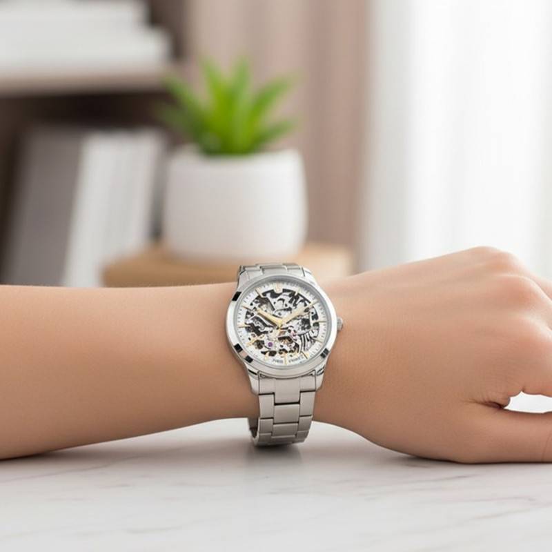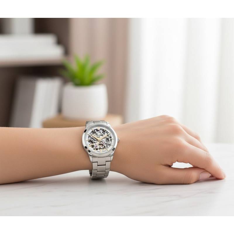 L'élément distinctif de ce garde-temps réside dans son cadran squelette, véritable vitrine du mécanisme interne où chaque mouvement devient spectacle. Avec des index habilement placés et un chemin de fer des minutes harmonieux, le cadran assure une lisibilité parfaite. L'absence de chiffres permet de conserver une esthétique épurée, sublimée par les aiguilles qui procurent un suivi précis des heures, minutes, et secondes.