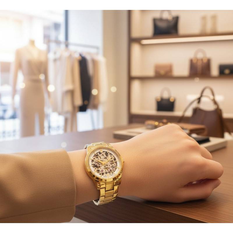 Le bracelet de cette montre est un magnifique complément au boîtier sophistiqué, fabriqué en acier poli brillant de couleur jaune. Cette élégance métallique est un parfait équilibre entre durabilité et style moderne. Le bracelet mesure 18 mm à l'entrecorne, assurant un ajustement ferme et un confort optimal au poignet. Il est équipé d'une boucle déployante, un dispositif pratique qui offre une sécurité renforcée lors de son port.