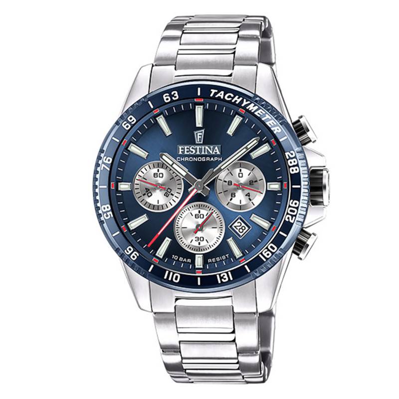 Ocarat vous présente le nouveau chronographe Festina, la montre Timeless Chronograph F20560/2 à l'allure moderne et élégante. Son style bicolore vous plonge dans un univers unique, et vous accompagnera au travail comme au sport. Elle est composée d'un boîtier en acier inoxydable qui mesure 45 mm de diamètre. Une taille parfaite pour offrir une entière lisibilité du cadran et de ses éléments. Afin de la régler, un bouton-remontoir ainsi que deux bouton-poussoirs se trouvent sur sa droite et actionnerons les aiguilles ainsi que les fonctions de la montre. Une lunette bleue vient envelopper le cadran en vous proposant une échelle tachymétrique pour mesurer vos performances. Un verre minéral surplombe le cadran pour lui garantir une parfaite protection contre les usures et les rayures occasionnées par le quotidien. L'ensemble de ses éléments font de cette montre un modèle étanche jusque 10 ATM, ce qui correspond à 100 mètres.