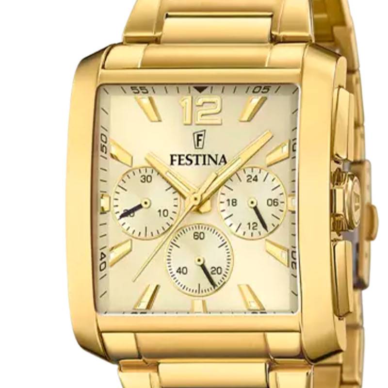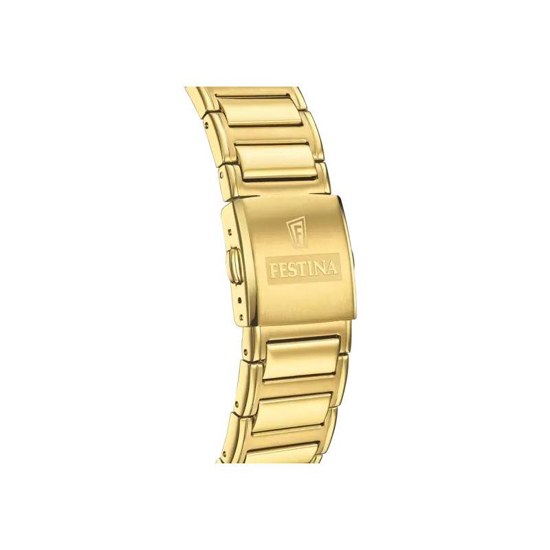 Le bracelet est réalisé en acier inoxydable 316L doré paré de trois rangées de maillons. Vous pourrez compter sur la boucle déployante simple de la même couleursignée Festina pour ouvrir et fermer ce merveilleux modèle dont l'entrecorne mesure 29 mm.