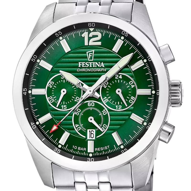 Le cadran du modèle Timeless Chronographe de Festina est un véritable spectacle visuel. Sa couleur verte vibrante, avec une finition double cercle et striée, capte la lumière sous tous les angles, créant un jeu de reflets fascinant. Les chiffres et index luminescents se détachent élégamment sur ce fond vert, facilitant la lecture même dans des conditions de faible luminosité. Les aiguilles, également luminescentes, assurent une visibilité parfaite des heures, minutes et secondes en tout temps. La montre est équipée de trois compteurs additionnels : un pour les 24 heures, un pour 30 minutes et un pour les petites secondes, intégrés d'une manière harmonieuse pour ne pas compromettre l'élégance globale du cadran. De plus, un guichet date positionné astucieusement complète ce cadran ingénieusement conçu qui allie esthétisme et fonctionnalité.