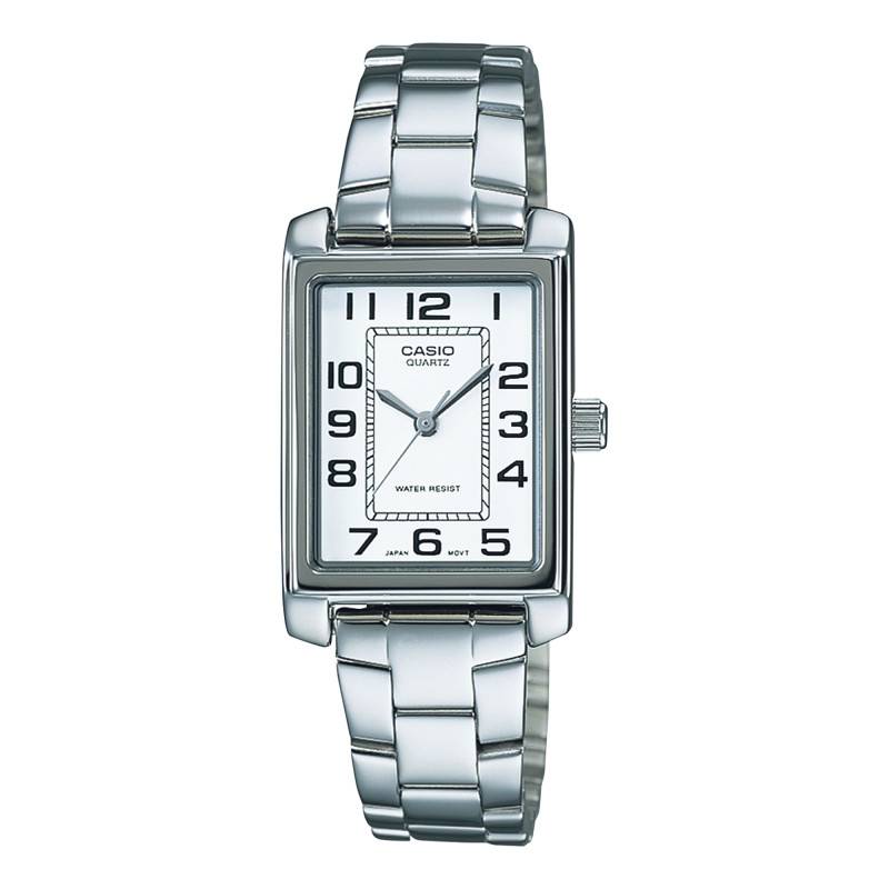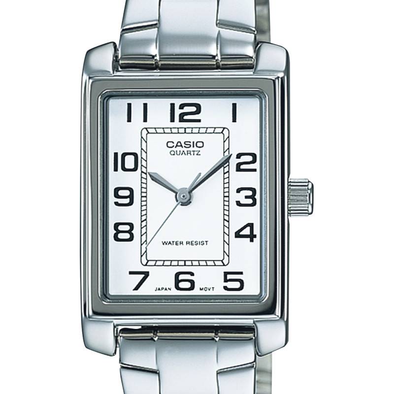 La montre Casio LTP-1234PD-7BEG incarne un design intemporel avec son boîtier à la forme rectangulaire, mesurant 32 mm de long sur 21 mm de large et 7,4 mm d'épaisseur. Conçu pour être à la fois élégant et fonctionnel, son boîtier est en acier inoxydable, offrant une résistance remarquable et une finition polie qui capte la lumière avec élégance. Le boîtier est orné d'un bouton remontoir discret sur le côté droit, conçu pour ajuster l'heure facilement. L'ensemble de la montre pèse environ 57 grammes, ce qui la rend légère et confortable pour un port quotidien.