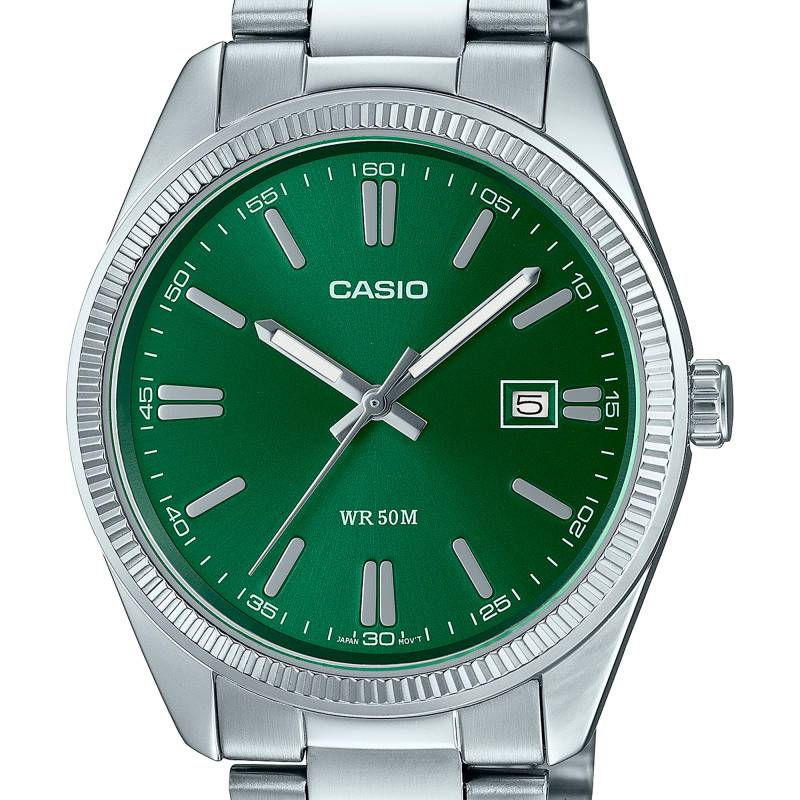 Au cœur de cette montre bat un mouvement quartz japonais de la marque Casio, reconnu pour sa fiabilité et sa durabilité. Sa réserve de marche de trois ans, avec une seule pile, permet une utilisation prolongée sans souci de remplacement fréquent. Le mécanisme assure un affichage précis des heures, minutes, secondes et de la date, rendant ce modèle idéal pour ceux qui exigent précision et constance jour après jour.