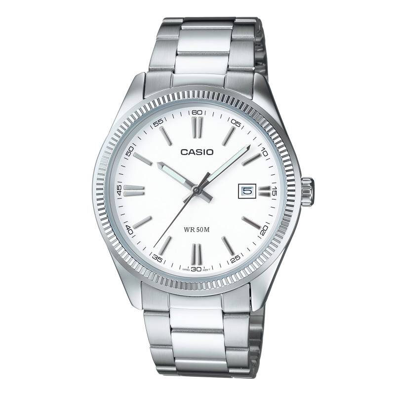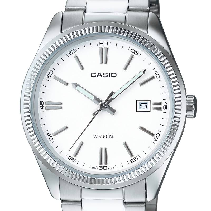 Le cadran de cette montre Casio Timeless est un exemple de lisibilité et de sobriété. Paré d'une finition mate de couleur blanche, il capte la lumière tout en douceur, minimisant les reflets indésirables. Les chiffres arabes et les index sont extrudés sur le contour, facilitant une lecture instantanée. Un chemin de fer des minutes orne le pourtour, ajoutant une dimension pratique supplémentaire à l'esthétique du cadran. Les aiguilles luminescentes offrent une lecture de l'heure aisée, même dans des conditions de faible luminosité. Le guichet date, discrètement positionné, ajoute une fonctionnalité utile, soulignant la fonctionnalité et le design réfléchi de cette montre.