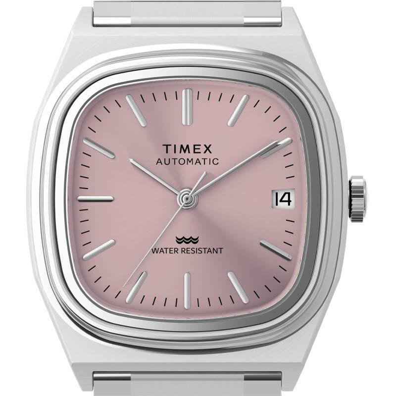La montre Timex Automatic 1983 E Line est une pièce d'horlogerie qui réunit à merveille style rétro et modernité. Le boîtier est en acier inoxydable, offrant une robustesse et une longévité exceptionnelles, tout en conservant une légèreté confortable avec un poids de 76 grammes. La finition du boîtier, à la fois mate et polie, contribue à l'aspect élégant de ce garde-temps. Avec ses dimensions compactes de 34 mm de largeur et une épaisseur de 12,5 mm, cette montre convient parfaitement aux poignets féminins et masculins, apportant une touche de sophistication sans excès. Le design général du boîtier évoque un retour aux années 80 avec sa forme rectangulaire singulière.