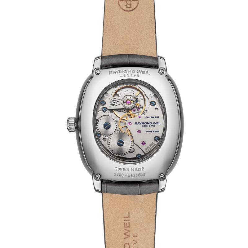 Dans ce garde-temps, bat le mouvement mécanique suisse RW4100 de Raymond Weil, garant d'une précision horlogère inégalable. Ce mécanisme à remontage manuel est une démonstration d'ingénierie de haute qualité, offrant une réserve de marche allant jusqu'à 45 heures, assurant ainsi une durabilité d'utilisation sans besoin de remontage fréquent. La fréquence et la fiabilité du calibre suisse sont mises en valeur à travers le fond transparent de la boîte.