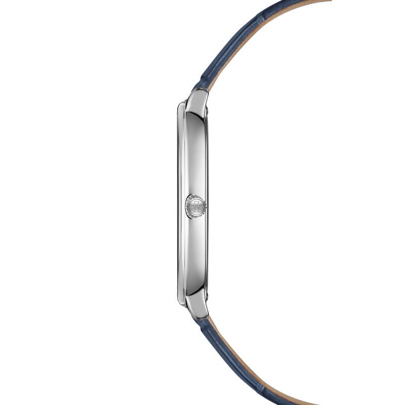 Le bracelet de cette montre Toccata est réalisé en cuir de veau avec un motif alligator, rehaussant l'aspect luxueux de la pièce. Le bracelet est d'un élégant ton bleu, s'alliant parfaitement avec le cadran pour un ensemble harmonieux et stylé. Avec sa boucle ardillon, le bracelet assure une fermeture sécurisée tout en permettant un ajustement facile au poignet.