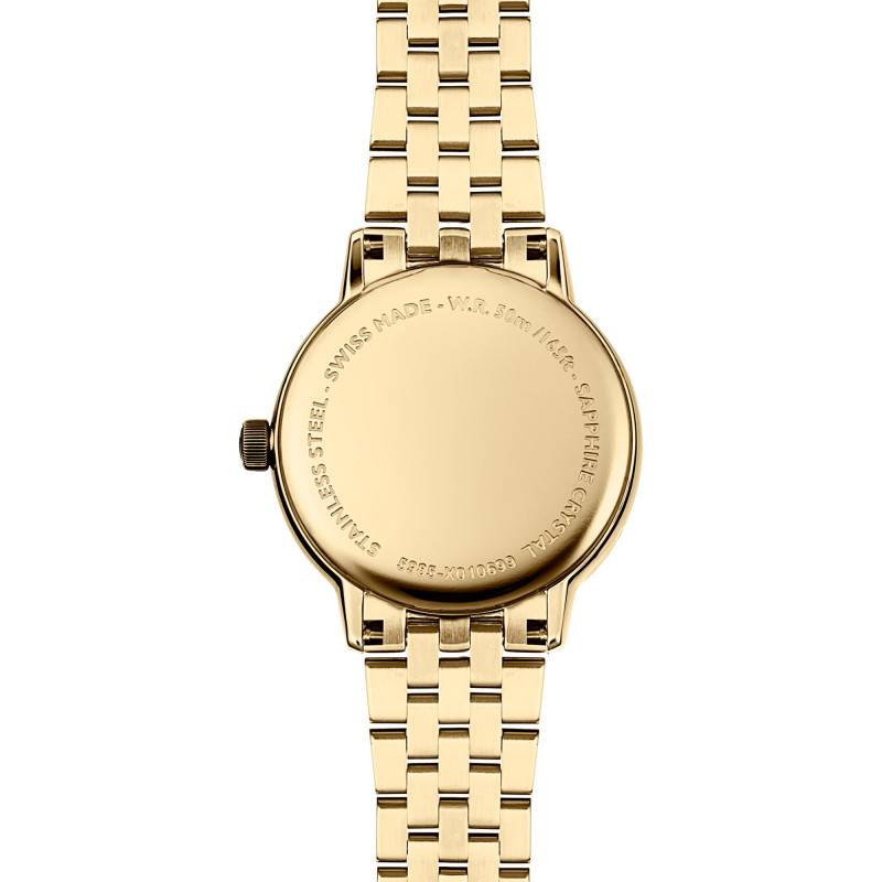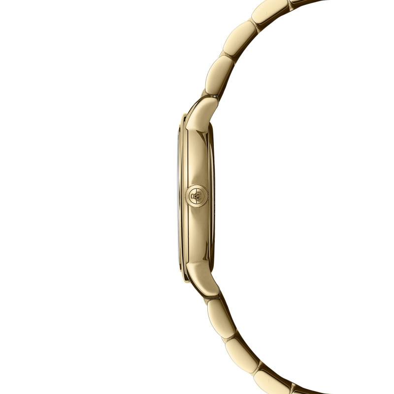 Le bracelet conçu en acier inoxydable, revêtu d'une finition PVD or jaune, incarne à lui seul une prouesse technique et esthétique. Avec sa sobriété brillante et son allure chic, il se marie idéalement au boîtier de la montre. Sa finition polie rehausse d'un éclat doré chaque oscillation du poignet. Doté d'une boucle déployante sécurisée par un fermoir de sécurité doré, il assure à la fois une mise en place aisée et une tranquillité d'esprit garantie, sachant que la montre reste fixée avec sûreté quelle que soit l'activité.