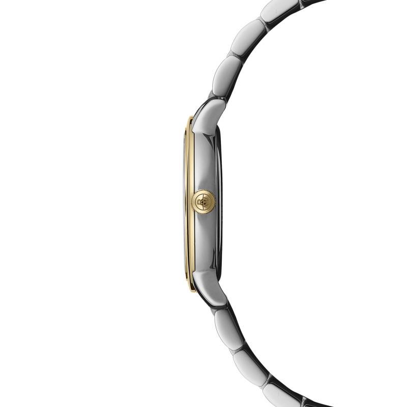 Le bracelet en acier inoxydable, combine des maillons aux tons gris et jaune. Cette disposition bicolore est non seulement esthétiquement plaisante, mais également très moderne. La finition polie accentue la sophistication du design, tandis que la boucle déployante assure un maintien sûr et confortable au poignet, accentuant encore le caractère raffiné de ce garde-temps.