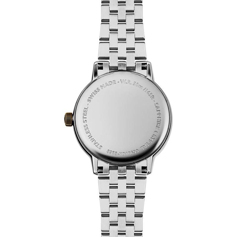 Cette montre est animée par un mouvement quartz suisse, assurant une fiabilité et une précision sans faille. Ce choix de mécanisme permet une utilisation simple et nécessite peu d'entretien, faisant de cette montre un choix pratique pour celles qui recherchent à la fois l'élégance et l'efficacité. La montre affiche les heures, les minutes et la date, offrant ainsi une lecture claire et précise du temps.