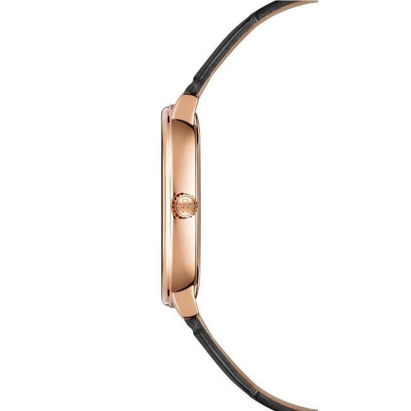 Le bracelet en cuir de veau avec une finition motif alligator ajoute une touche de sophistication au modèle, tandis que la boucle ardillon assure une sécurité et un confort optimaux. Ce matériau noble et durable s'harmonise parfaitement avec l'élégance du boîtier, complétant cet ensemble cohérent de haute qualité.