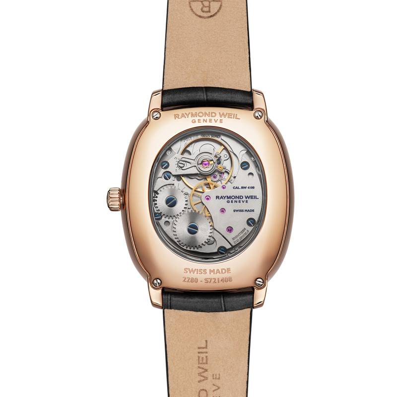 La montre Toccata Heritage de Raymond Weil se distingue par son esthétique raffinée et sa qualité supérieure. Conçue pour les hommes, ce garde-temps incarne l'élégance avec son boîtier en acier inoxydable recouvert de PVD rose, offrant une finition polie et brillante qui capte la lumière à chaque mouvement. Avec une longueur de 38 mm, une largeur de 33 mm et une épaisseur de seulement 6.95 mm, cette montre se veut discrète et confortable tout en étant une pièce d'exception. Le fond transparent, maintenu par des vis, permet d'admirer le mécanisme suisse sophistiqué, ce qui renforce son caractère de haute horlogerie.