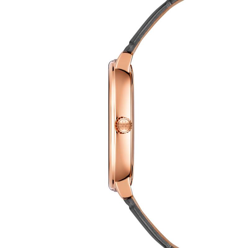 Attachée à un bracelet qui ne passe pas inaperçu, cette montre arbore une attache en cuir de veau gris avec un motif alligator. Ce choix de matériau offre un confort exceptionnel tout en ajoutant une touche de luxe sans pareille. La boucle ardillon est inspirée de la forme du boîtier, renforçant l'harmonie du design général. Ajustée sur mesure, elle s'adapte parfaitement à chaque poignet, assurant sécurité et style tout en étant facile à manipuler.