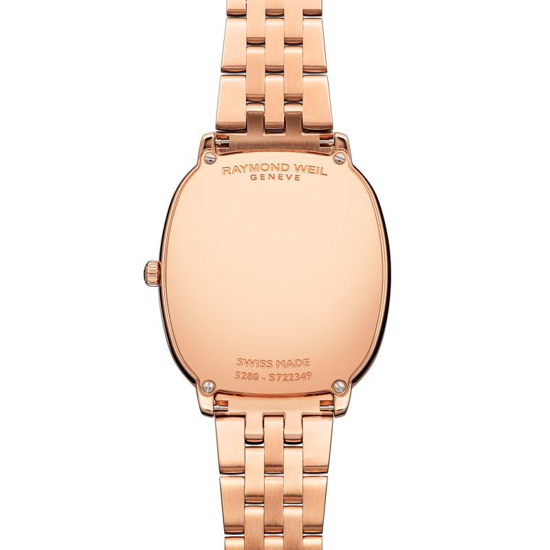Raymond Weil présente avec la collection Toccata Heritage, une montre qui incarne l'essence même du savoir-faire horloger suisse. En hommage aux cinq décennies de tradition, cette montre est un métissage de design classique et de technologie moderne. Le boîtier arbore une forme oblongue subtile, mesurant 36 mm de longueur et 31 mm de largeur, tandis que son épaisseur de 5,10 mm ajoute à sa finesse. Fabriqué en acier inoxydable, le boîtier bénéficie d'un somptueux revêtement en PVD rose, soulignant une finition polie et brillante. La lunette, magnifiquement sertie de 60 diamants (0,51 ct) d'une pureté brillante, rehausse l'élégance de cette montre.