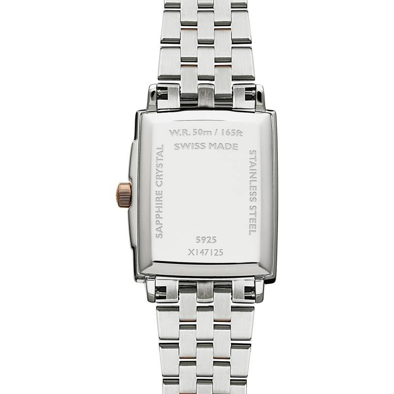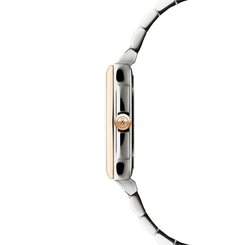 Le bracelet de cette montre allie sophistication et confort. Réalisé en acier inoxydable avec des maillons en PVD or rose, il offre une allure élégante distinctement féminine. Son fini poli accentue le luxe de l'ensemble, tout en s'harmonisant parfaitement avec le boîtier de la montre. Grâce à un fermoir à boucle déployante sécurisée, l'attache est solide et facile à manipuler, assurant que la montre reste parfaitement en place.