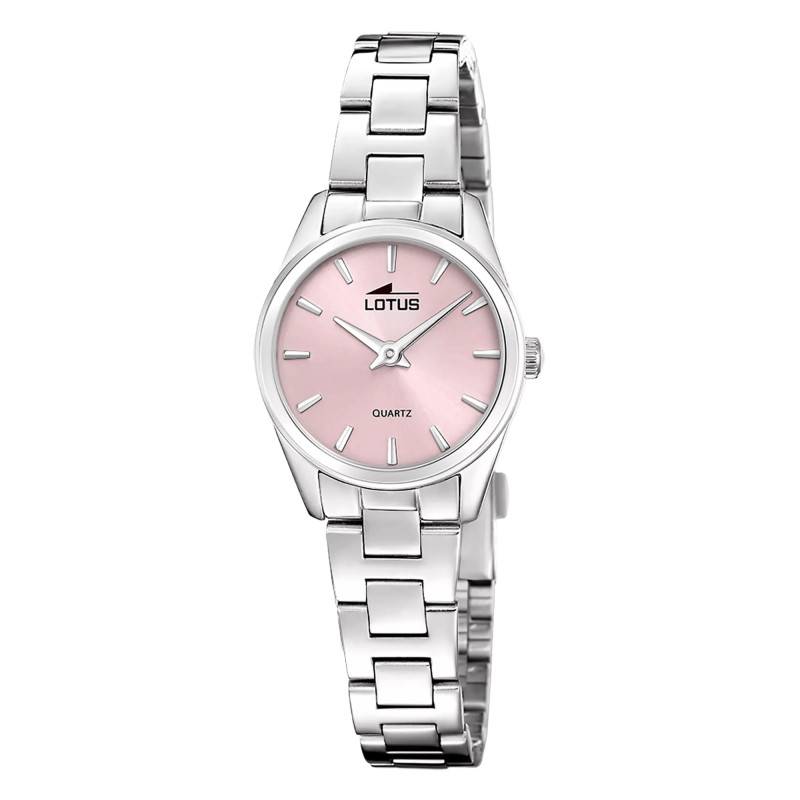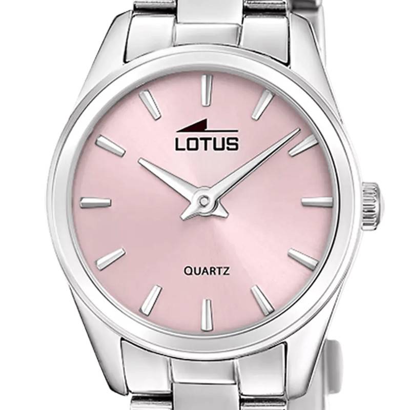 Le cadran de cette montre Lotus est un véritable atout de charme grâce à sa finition soleillée, qui lui permet de capturer et de réfléchir la lumière de manière somptueuse, ajoutant une dimension dynamique à son apparence. De couleur rose, le cadran arbore des index argentés appliqués avec une précision exemplaire. Les aiguilles, également en acier, ajoutent une touche de sophistication avec leurs mouvements précis, indiquant les heures et minutes grâce à un affichage analogique. Le verre minéral qui protège le cadran contribue à préserver sa beauté, apportant une barrière contre les petites rayures et la poussière.