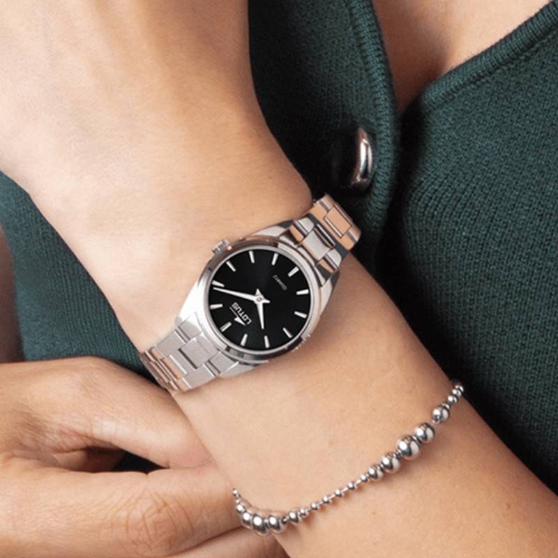 La montre pour femme Lotus Together se distingue par son boîtier rond en acier inoxydable offrant une allure moderne et élégante. Sa finition polie et brillante reflète la lumière avec subtilité, ajoutant une touche lumineuse à chaque mouvement du poignet. Le boîtier, avec un diamètre de 26 mm et une épaisseur de 7,15 mm, assure un confort indéniable sans compromettre le style. Par son poids de 50 g, elle est légère et agréable à porter, ce qui en fait un accessoire idéal pour un usage quotidien. En outre, ce modèle est équipé d'un verre minéral de haute qualité, reconnu pour sa dureté et sa résistance aux rayures accidentelles. Un bijou bracelet est offert en complément de la montre pour accompagner avec style votre poignet.