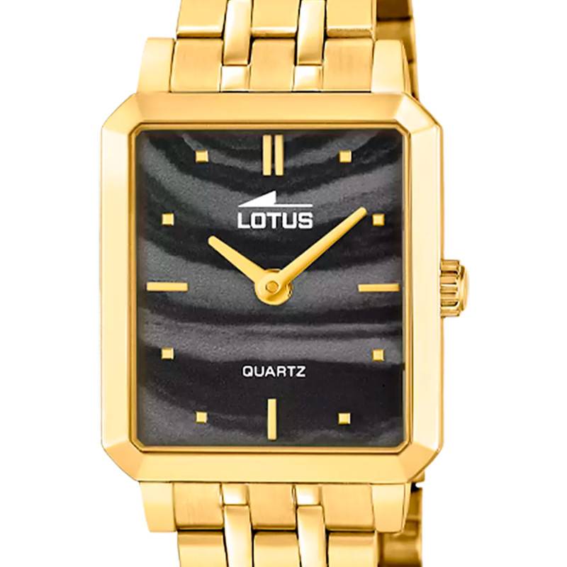 Le cadran de cette montre Lotus est un véritable atout esthétique. Sa couleur noir profond contraste parfaitement avec les index dorés, créant un jeu de lumière élégant et distinctif. La surface texturée du cadran apporte une dimension supplémentaire à l'apparence de la montre, ajoutant une touche raffinée et sophistiquée. Le cadran affiche l'heure grâce à des aiguilles dorées, permettant une lisibilité parfaite quelles que soient les conditions de lumière.