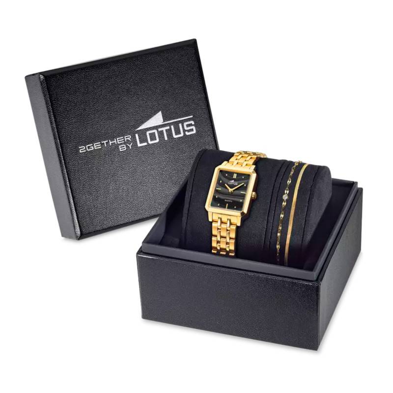 La montre Lotus Together 19009/4 se distingue par son allure résolument chic et élégante, adoptant un design rectangulaire atypique qui sort du lot. Fabriquée en acier inoxydable avec une superbe finition en PVD jaune, cette pièce offre une résistance remarquable et un éclat exceptionnel. Le boîtier, d'un diamètre de 22 mm et d'une épaisseur de 7,05 mm, enveloppe un cadran parfaitement protégé par un verre minéral, gage de durabilité et de résistance contre les rayures du quotidien. Avec un poids plaisant de 55 g, elle se pose délicatement sur le poignet, procurant ainsi un confort optimal.