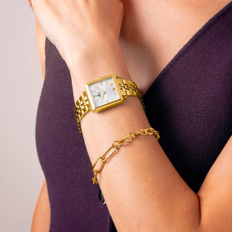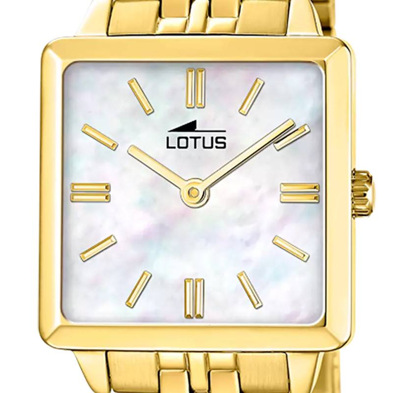 La montre Lotus Together se distingue par son allure particulièrement élégante et féminine. Fabriquée en acier inoxydable recouvert d'une finition PVD jaune polie, elle arbore une allure luxueuse et durable. Le boîtier de forme carrée aux dimensions de 26 mm de côté, s'intègre dans un ensemble léger mais prononcé par un poids de 63 g. Un verre minéral plat vient sublimer et protéger le cadran, tout en lui offrant un éclat particulier grâce à sa surface lisse et résistante. Le petit bouton remontoir latéral fait preuve de discrétion et de finesse, permettant de régler l'heure avec une précision délicate.