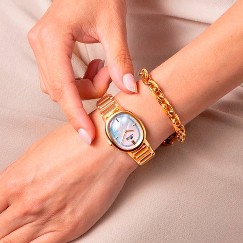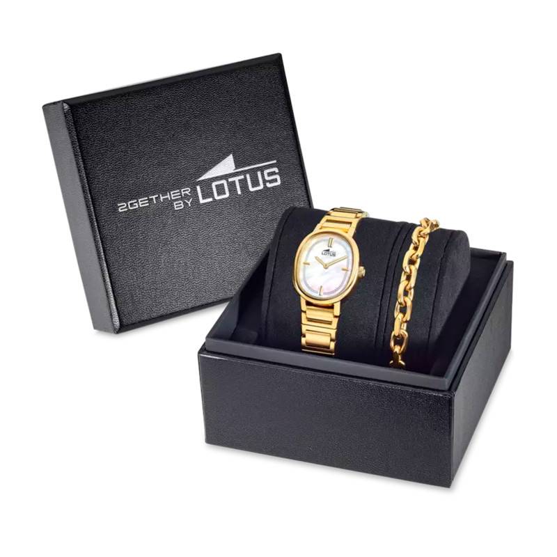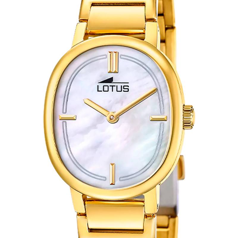 La montre Lotus Together pour femmes s'illustre par son design harmonieux et sa construction soignée. Le boîtier en acier inoxydable arbore une silhouette ovale au diamètre délicat de 25,70 mm, et une épaisseur de 7,00 mm, ce qui en fait un accessoire élégant et peu encombrant sur le poignet. Dotée d'une finition PVD jaune polie, elle brille de mille feux, accentuant sa présence féminine et luxueuse. Le poids du boîtier est suffisamment léger à 52,00 g, permettant un port confortable au quotidien. La précision de son verre minéral garantit une bonne résistance aux rayures, tandis que le bouton unique remontoir sur le côté assure un ajustement aisé de l'heure. La montre est livrée avec un bracelet assorti.