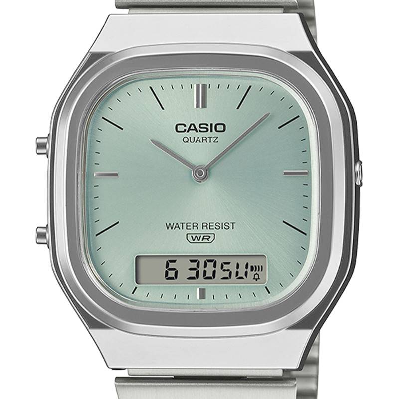 La montre, un modèle de la ligne Casio Vintage, propose un style rétro inimitable avec son boîtier de forme carrée habillé d'une teinte discrète en gris et vert. Fabriquée en résine de haute qualité, elle affiche une solidité à toute épreuve tout en conservant une légèreté remarquable avec un poids de 51 g, rendant son port agréable et presque imperceptible tout au long de la journée. Les dimensions de la montre, avec un diamètre de 35,8 mm et une épaisseur de 8,1 mm, permettent une présence élégante mais discrète sur le poignet. Le boîtier est surmonté d'un verre acrylique, synonyme de légèreté et de résistance adaptée à un usage quotidien. Ceci est parachevé par un fond de boîtier emboîté, garantissant une sécurité de l'intérieur de la montre tout en facilitant son entretien. Pour un ajustement précis, trois boutons poussoirs facilitent la gestion des nombreuses fonctionnalités offertes.