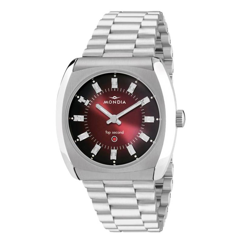 Mondia est une marque qui s'est imposée grâce à la haute qualité et à la performance de ses montres. Depuis 1935, elle conçoit des modèles qui illustrent à la perfection sa passion, sa créativité et sa constante innovation. Aujourd'hui, elle est fière de vous dévoiler cette fabuleuse montre Top Second MH-004-SS-RD-CM qui est une évolution moderne du modèle emblématique de 1972. Parfait pour tous les hommes en quête d'authenticité, il présente un boîtier de forme coussin conçu en acier inoxydable 316L poli et brossé. Ce dernier mesure 37,50 mm de largeur pour une longueur de 38 mm et une épaisseur de 13 mm. Il intègre un verre saphir incurvé qui recouvre le cadran afin de le protéger des chocs et des dommages quotidiens. Son traitement antireflet offre une lisibilité optimale des indicateurs centraux. La couronne placée à 3 heures permet de régler les fonctions en offrant une manipulation facile. Pour finir, le fond de boîte vissé garantit une étanchéité de 5 ATM.