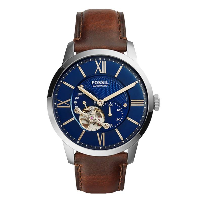 Pour marquer le coup dans l'originalité, la marque Fossil positionne en nouveauté un modèle automatique "à cœur ouvert" sur son mouvement. Ce cadran bleu affilié aux aiguilles et index argent met très bien en valeur les rouages visibles à 7h. Le tout a été déposé dans un écrin en acier inoxydable monté d'un verre minéral que l'on retrouve également au dos de ce dernier, avec une monture cuir marron aux surpiqûres ton sur ton.