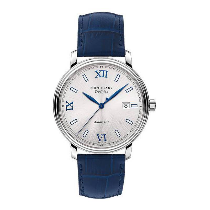 Le cadran de cette 129285 ne manquera pas de confirmer la touche luxueuse de la maison Montblanc. En effet, vous retrouverez tout d'abord un fond de cadran soleillé gris qui s'illuminera selon la lumière. Les aiguilles des heures et des minutes en forme de feuille viendront ajouter une touche de couleur au cadran avec leur teinte bleuie. La trotteuse en forme bâton est elle aussi bleuie et arbore en sa base l'emblème de la marque allemande. Pour ce qui est des index vous retrouverez des chiffres romains bleus cadrés d'un liseré blanc et des bâtons blancs cadrés de bleu. Un fin chemin de fer des minutes carré vient habiller le pourtour du cadran. A trois heures, vous noterez la présence du guichet rectangulaire qui vous indiquera la date du jour. Enfin, on observera la mention "Automatic" à six heures et la nomination de la marque et de la collection à douze heures.