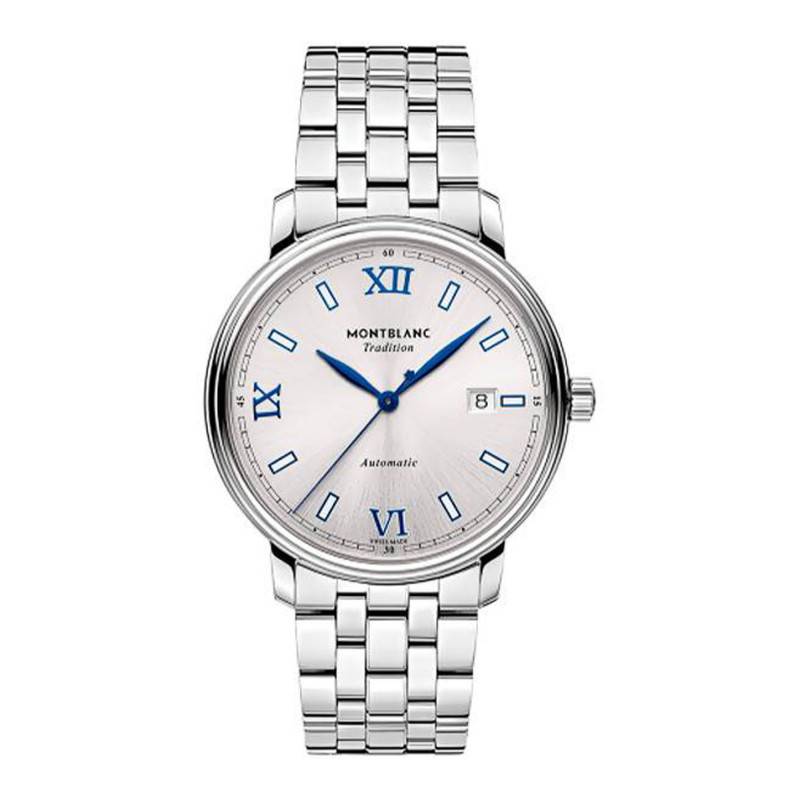 En vous indiquant l'heure avec fluidité et précision, ce ravissant cadran rond s'accorde à votre tenue en toute occasion. Il se pare d'une sublime couleur gris argent accentuée par une finition soleillée. Le tout confère une touche lumineuse et captivante qui mettra votre poignet en valeur. Le pourtour est rehaussé par un chemin de fer des minutes suivi par des index en chiffres romains bleus pour 6h, 9h et 12h et des index bâtons pour le reste. L'ensemble est parcouru par deux aiguilles feuilles d'une couleur bleue et une fine trotteuse bleue. Elles vous indiqueront toutes les trois les heures, les minutes et les secondes. Pour parfaite la consultation de votre montre, un guichet-date vient se positionner à 3h. Montblanc signe le cadran avec son nom et le nom de la collection sous midi, appose le type de mouvement et la mention “Swiss Made" à 6h et embellit le bout de la trotteuse par son logo.