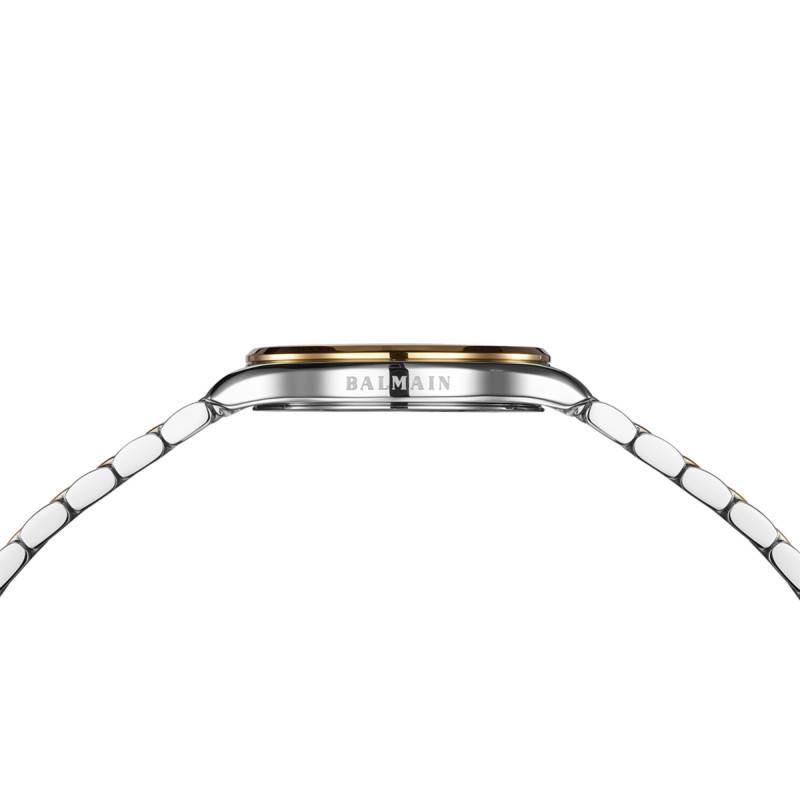 Balmain est une entreprise de haute couture française qui propose des garde-temps répondant à de très hautes exigences de qualité. De fabrication suisse, ses modèles se distinguent par leurs détails conçus à la perfection afin de combler les envies exigeantes des hommes et des femmes d'aujourd'hui. Toujours en quête du luxe, elle présente la montre Tradition Beleganza Lady M B83523918 qui se démarque par ses lignes pures et son design intemporel. Celle-ci est dotée d'un boîtier rond parfaitement soigné conçu en acier inoxydable 316L de haute qualité garantissant ainsi sa durabilité. Il est sublimé par une finition polie offrant une élégance classique et comporte une lunette traitée au PVD or jaune pour un contraste sophistiqué. Avec son diamètre de 32 mm, il promet une apparence fine et charmante au poignet pour les femmes. Son épaisseur de 6,30 mm et sa longueur de corne à corne de 38 mm mettent aussi en avant son apparence féminine. Au-dessus de la carrure se trouve un verre saphir destiné à protéger le cadran contre les rayures. Par contre, sur le côté droit, se situe la couronne argentée et crantée qui vous facilitera le réglage des heures, des minutes et de la date. Le dos, quant à lui, est fermé par un fond de boîte qui promet une étanchéité de 3 ATM.