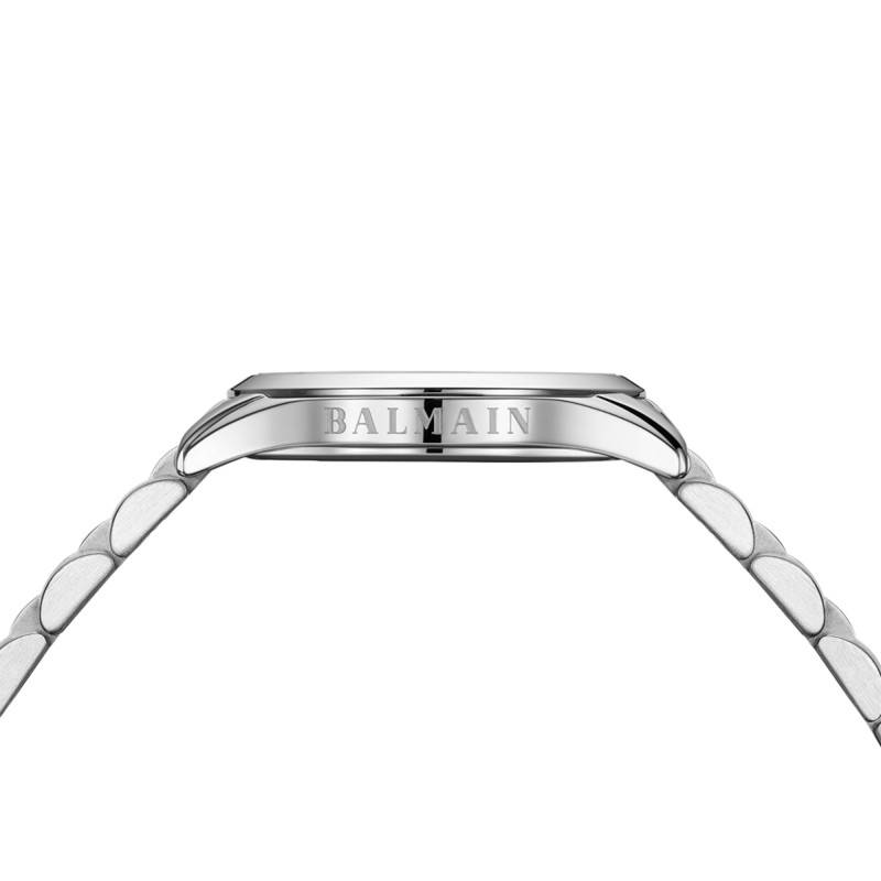 Le cadran rond de cette montre fascine par sa belle couleur bleu glacier et son fini soleillé, lui accordant un aspect raffiné et doux. Il accorde à l'ensemble une touche plus intemporelle et permet de lire l'heure avec fluidité et clarté. Au centre, deux aiguilles dauphines de couleur grise s'animent avec fluidité pour vous désigner les heures et les minutes. Les secondes écoulées vous seront indiquées au moyen de la fine trotteuse grise. Signé “Swiss Made”, le pourtour est marqué par un chemin de fer des minutes gradué par des traits noirs et accompagné de 5 en 5 par des index gris. Ceux-ci sont présentés par des chiffres romains et vous aideront à repérer rapidement les heures. Par ailleurs, un guichet prend place à 6h dévoilant des chiffres arabes noirs sur un fond blanc, ce qui vous permettra de lire la date du jour. Balmain marque sa signature sous midi en apposant son nom en lettres noires.