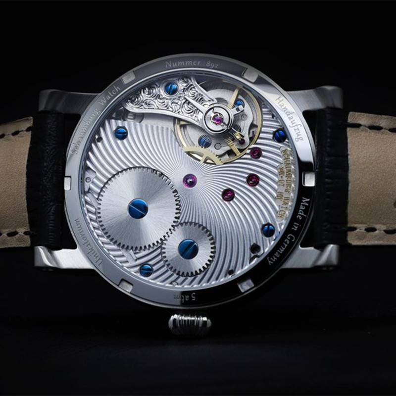 Le mouvement qui régit cette montre analogique est de type mécanique, comme vous pourrez le constater sur le fond de boîte. A remontage manuel, le calibre SW-07.1 a été créé par Schaumburg Watches avec notamment une balance Etachron et un système anti-choc Incabloc. La fréquence de ce mouvement est de 18000 alternances à l'heure, et sa finition guillochée vous assure de sa beauté.