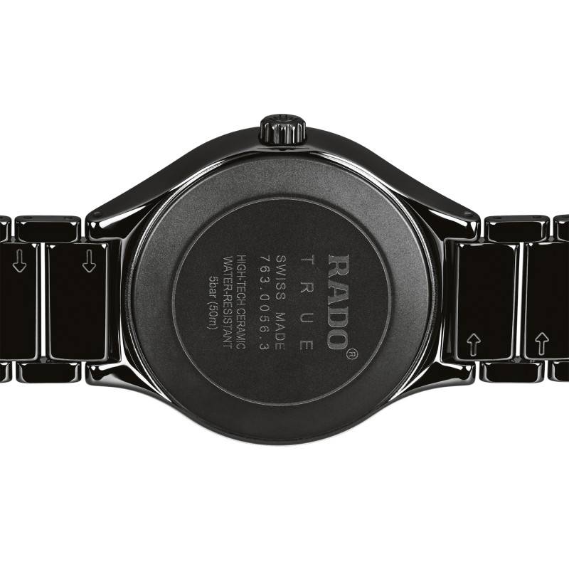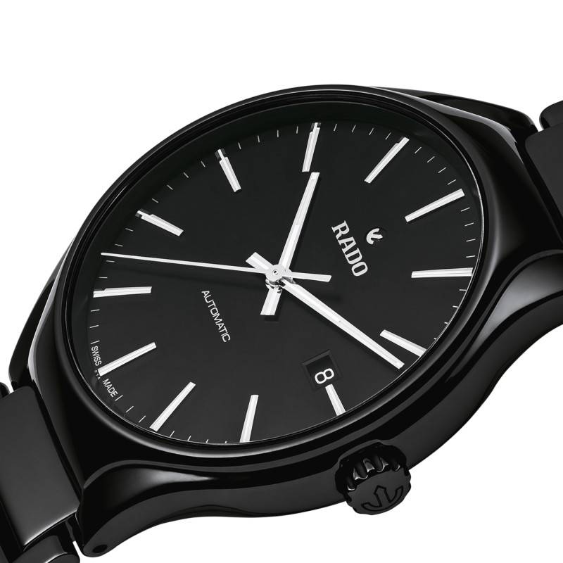 Cette Rado True Automatic propose une approche luxueuse de l'horlogerie avec son boitier rond en céramique noire. Ses dimensions sont raisonnables avec un diamètre de 40mm et une épaisseur de 10,4mm, il est surmonté d'un verre saphir traité antireflets. Rappelons que la céramique présente des avantages vis à vis de l'acier avec un poids inférieur (-25%) et une résistance aux rayures supérieure. Le fond de boîtier est plein.