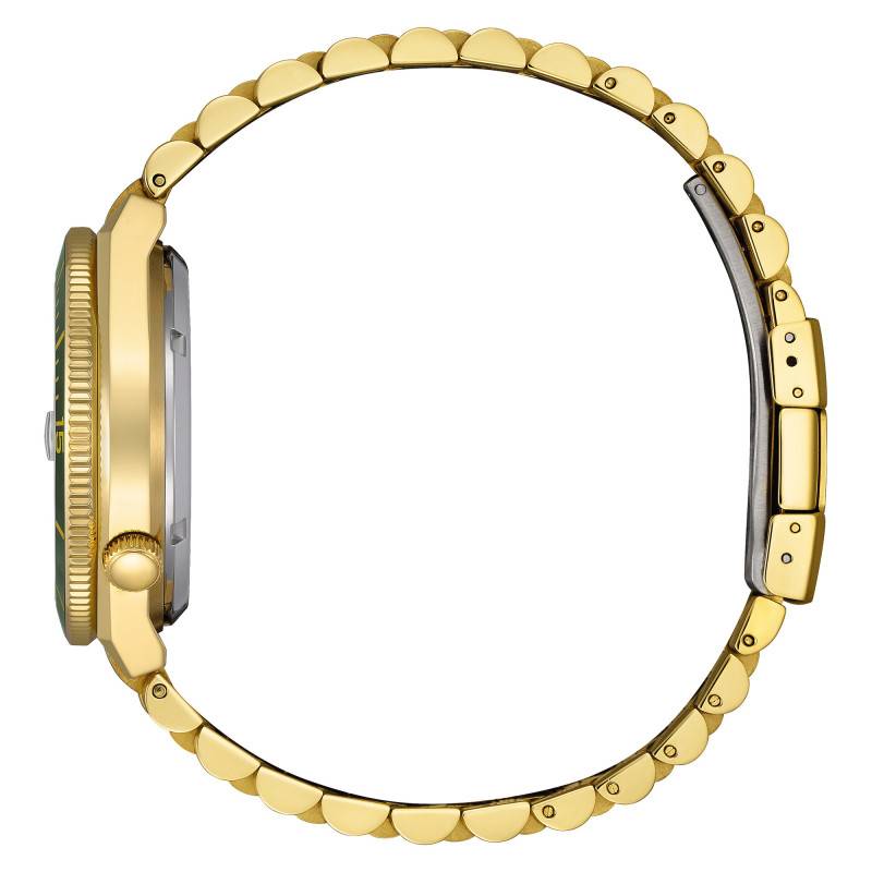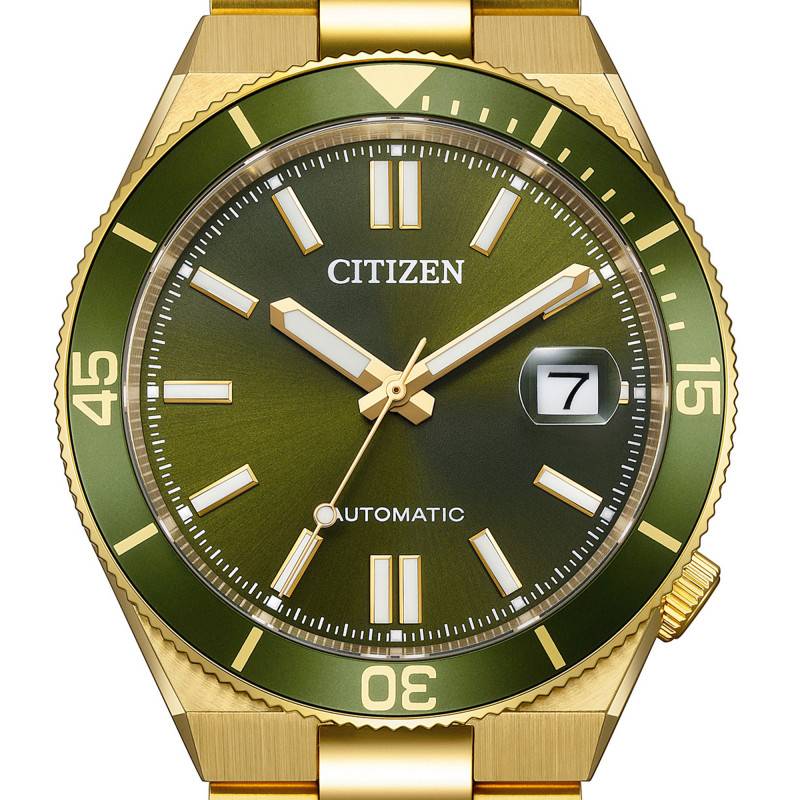 La superbe Citizen Tsuyosa Shore est une montre qui se distingue par son allure à la fois moderne et classique, conçue pour les hommes qui apprécient le style et la fonctionnalité. Dotée d'un boîtier en acier inoxydable robuste et résistant, elle affiche une forme tonneau élégante et un poids confortable de 149 g. Avec un diamètre de 40 mm et une épaisseur de 12,50 mm, cette montre offre une présence imposante sans être trop volumineuse, parfaite pour valoriser le poignet de son porteur. L'acier est traité avec un revêtement PVD jaune, qui confère une finition à la fois mate et brillante, rehaussant son design sophistiqué. La lunette rotative uni-directionnelle, bien intégrée, apporte une fonctionnalité supplémentaire, utile pour des activités liées à la navigation ou la plongée. L’attention aux détails se reflète également dans le fond transparent et vissé, permettant d’observer la mécanique en action et assurant la durabilité et l'étanchéité de la montre.