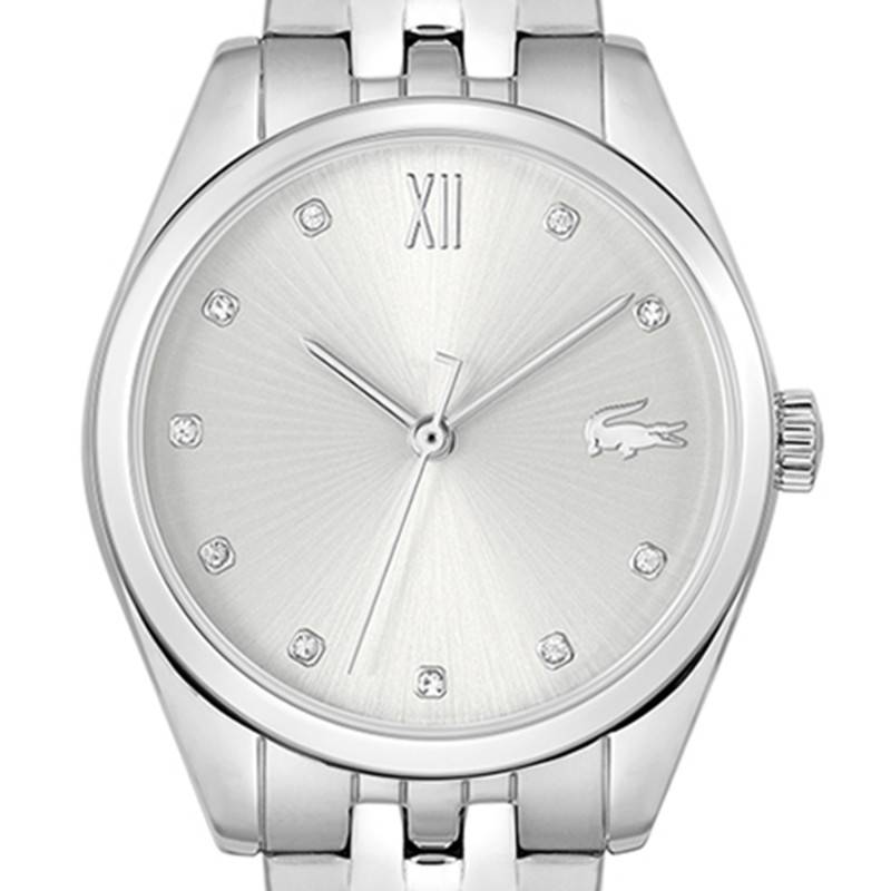 Lacoste est une marque qui a acquis une réputation dans l'univers de la mode. Spécialisée dans la fabrication de prêt-à-porter masculin et féminin, elle confectionne des modèles épurés qui séduisent. Depuis plusieurs années, elle s'invite dans le registre horloger et produit des modèles qui vous démarqueront avec élégance. Réalisant des montres qui incarnent son expertise, elle vous propose aujourd'hui cette belle montre Tuileries 2001301. Radieuse et élégante, elle s'impose par ses finitions soignées et son style branché. Son boîtier de forme rond est conçu en acier inoxydable argenté de 30,00 mm de hauteur et de largeur pour une épaisseur de 7,80 mm. Il est sublimé par des finitions polies et brossées et se destine aux poignets des femmes en quête de raffinement. Le cadran est surplombé d'un verre minéral et la couronne crantée à 3 heures permet le réglage des fonctions. Pour finir, le fond emboîté assure une étanchéité de 3 ATM.