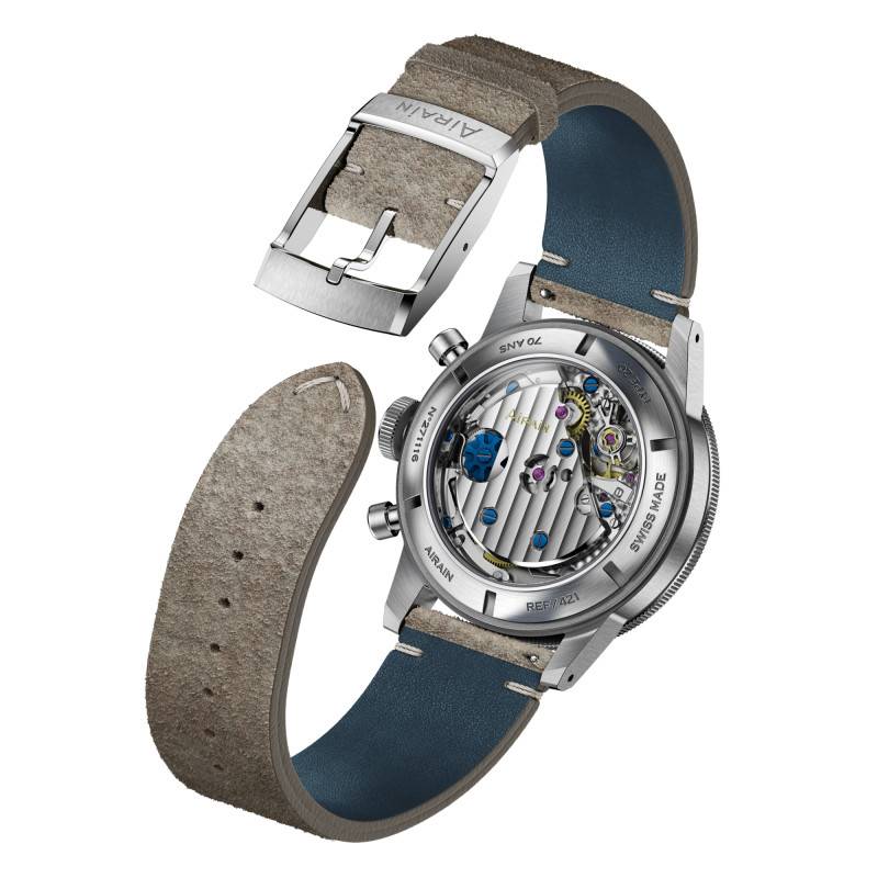 Ce modèle est équipé d'un mouvement mécanique à remontage manuel de fabrication suisse. Il s'agit plus exactement du calibre AM2 de Manufacture AMT à La Chaux-de-Fonds avec une complication flyback. Il assure avec fiabilité l'affichage analogique de ce modèle au quotidien. Ce mécanisme comporte 23 rubis et permet une réserve de marche de 63 heures.