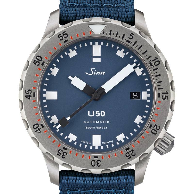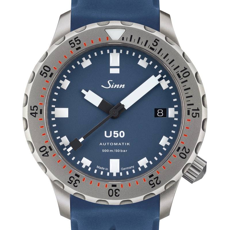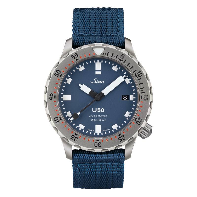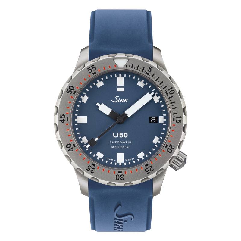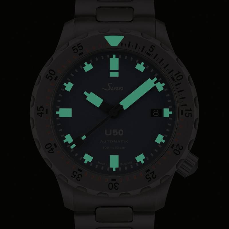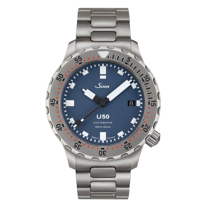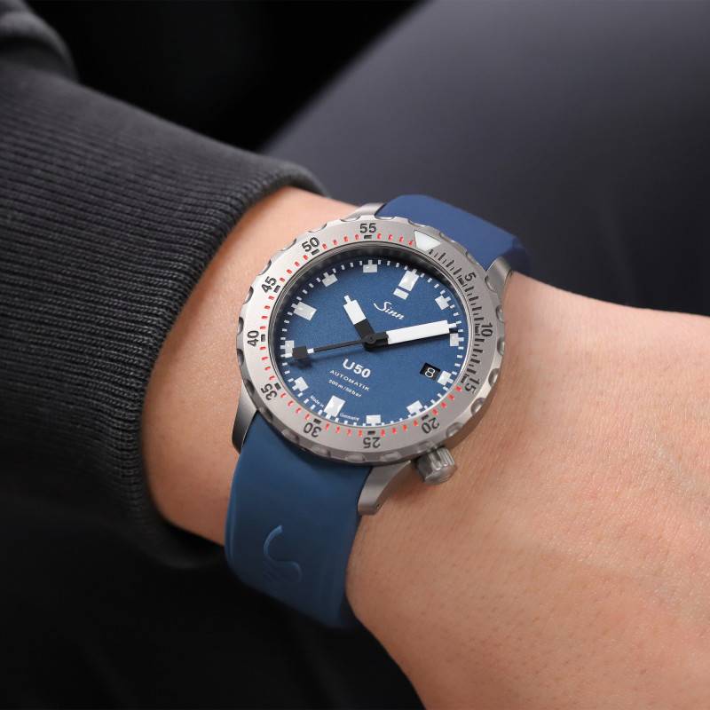 Le cadran de la montre Sinn U50 B est un modèle de sobriété et de lisibilité, principalement attribuables à sa finition mate bleu profond. Ce cadran captivant contraste superbement avec les chiffres arabes et les index blancs, qui sont traités pour briller dans l'obscurité, assurant une visibilité inégalée même sous l'eau. Conçu pour répondre aux besoins des plongeurs professionnels, le cadran intègre un guichet date à 3 heures, réglable via un bouton remontoir unique. Le verre saphir plat améliore encore davantage cette lisibilité en réduisant les reflets grâce à un traitement antireflet sur ses deux faces. Le contraste saisissant et l'orientation fonctionnelle du cadran, combinés à une couronne vissée placée à 4 heures, reflètent la conception réfléchie et sophistiquée de ce modèle.