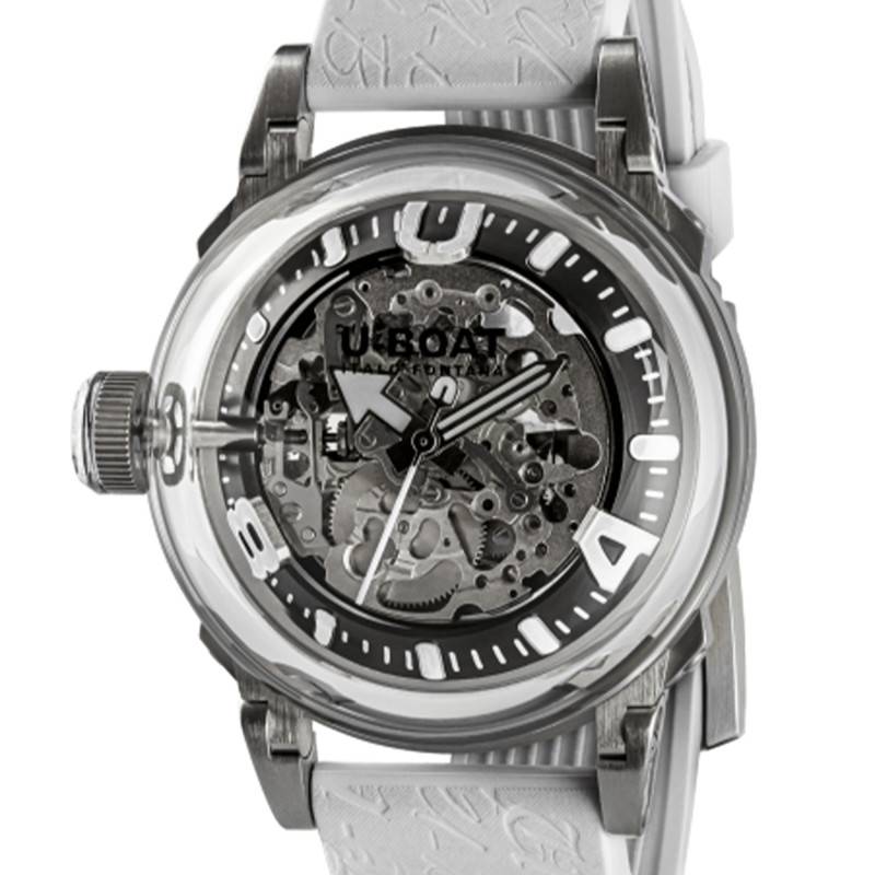 Découvrez la montre U-Boat U65 Automatic, un modèle qui combine à la perfection élégance moderne et technologie de précision. Ce garde-temps est abrité dans un boîtier rond de 44 mm, confectionné à partir d'un acier inoxydable 316L de haute qualité. Sa finition mate et polie confère un look raffiné, parfait pour un usage quotidien tout en restant robuste. Ce modèle affiche une esthétique unique grâce à sa transparence, permettant d'admirer le mouvement à travers un fond maintenu par des vis.
