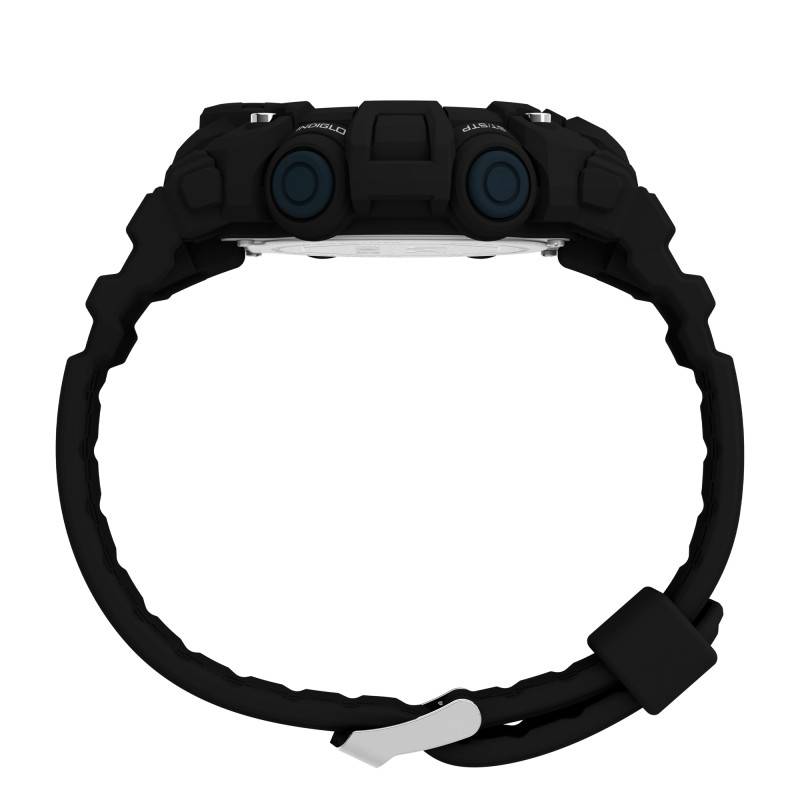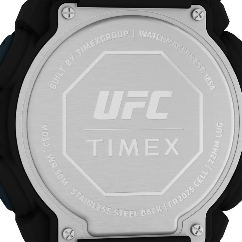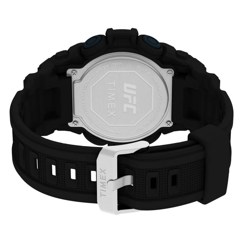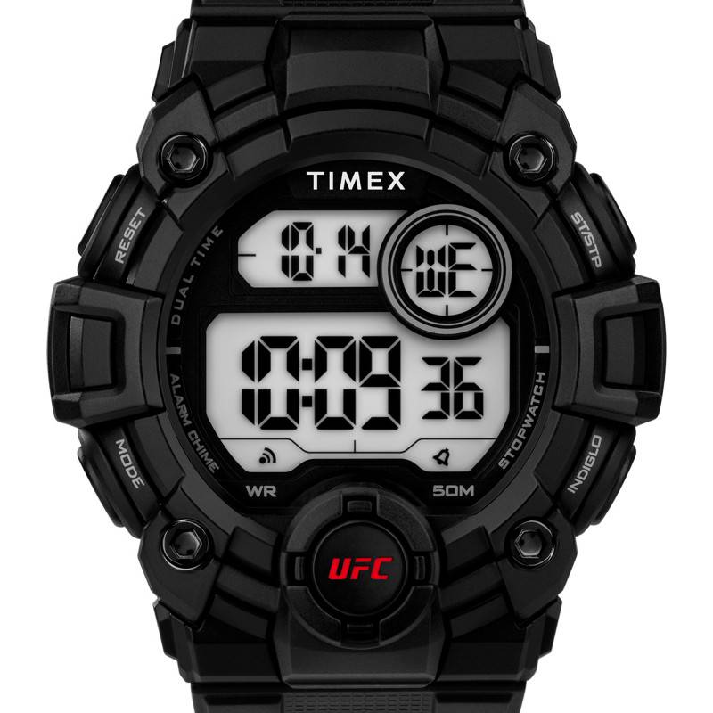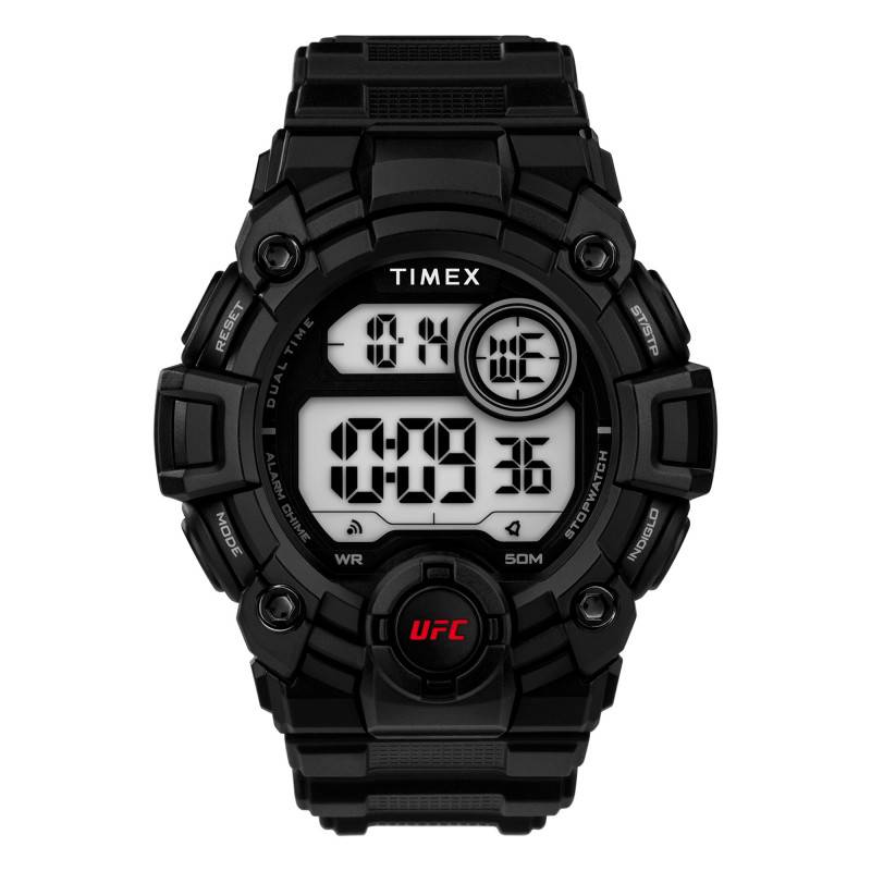 Depuis sa création en 1854, Timex propose des montres robustes qui allient élégance et praticité pour le plus grand plaisir de ses clients. C'est le cas de cette superbe montre Rematch TW5M53100. Pensée pour les hommes, cette dernière issue de la collection UFC et illustre parfaitement l'esprit sportif et moderne que veut véhiculer la marque. Elle se pare d'un boîtier en résine élaboré avec soin pour un port léger. Avec un diamètre de 50 mm, il épousera confortablement votre poignet. De forme ronde et de couleur noire, celui-ci saura compléter votre style de tous les jours et se trouve muni d'un fond de boîte maintenu par des vis qui garantit une étanchéité de 5 ATM. Sa surface est recouverte par un verre acrylique qui vous assurera une vue imprenable sur son cadran numérique. Enrichi de fonctionnalités essentielles, ce dernier vous communiquera le temps avec prestance et se trouve muni de diverses fonctions telles que l'alarme, le compte à rebours, un indicateur de date, de jour, de mois et un double fuseau horaire. Ces indicateurs seront réglés par les 4 boutons-poussoirs disposés de manière équitable à gauche et à droite de la carrure et prendront vie grâce à un mouvement quartz 03J de haute qualité alimenté par une pile CR2025 performante. Sachez que la marque a choisi pour ce modèle un bracelet en résine de teinte noire pour un rendu à la fois élégant et discret. Résistant et offrant un confort subtil, ce dernier mesure 22 mm de largeur d'entrecorne saura vous assurer du confort tout au long de son port. Il s'adaptera aux tailles de poignets allant de 150 à 205 mm et se trouve doté d'une boucle ardillon en guise de fermoir. Pour une lisibilité optimale dans les zones faiblement éclairées, son écran est muni d'un rétroéclairage Indiglo.