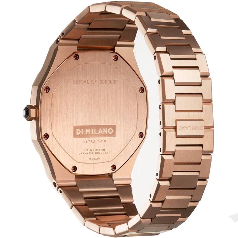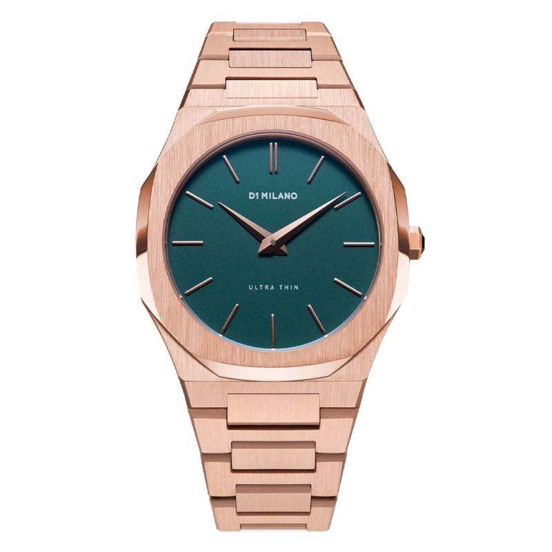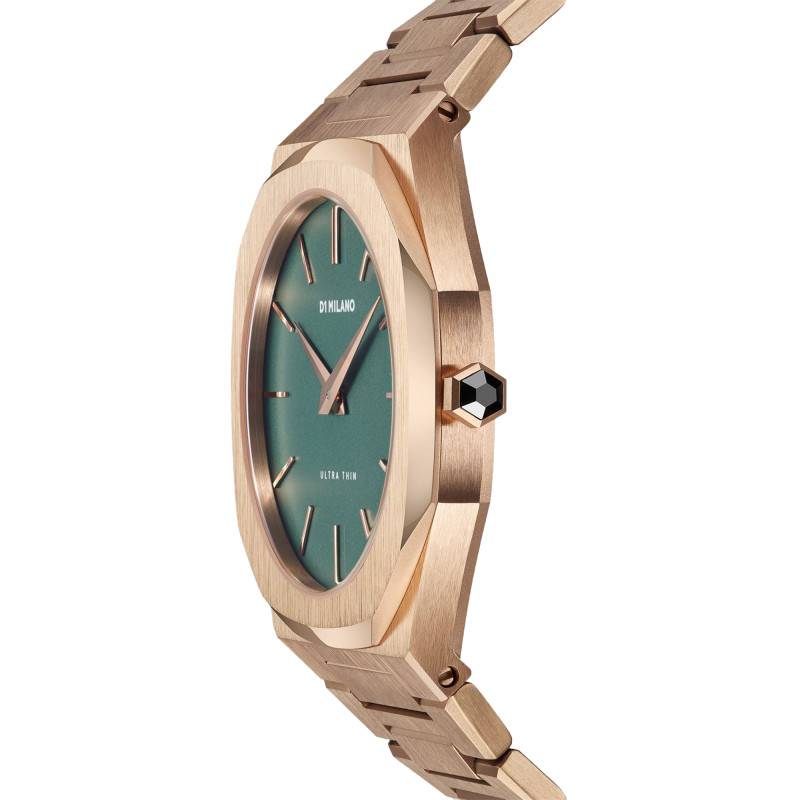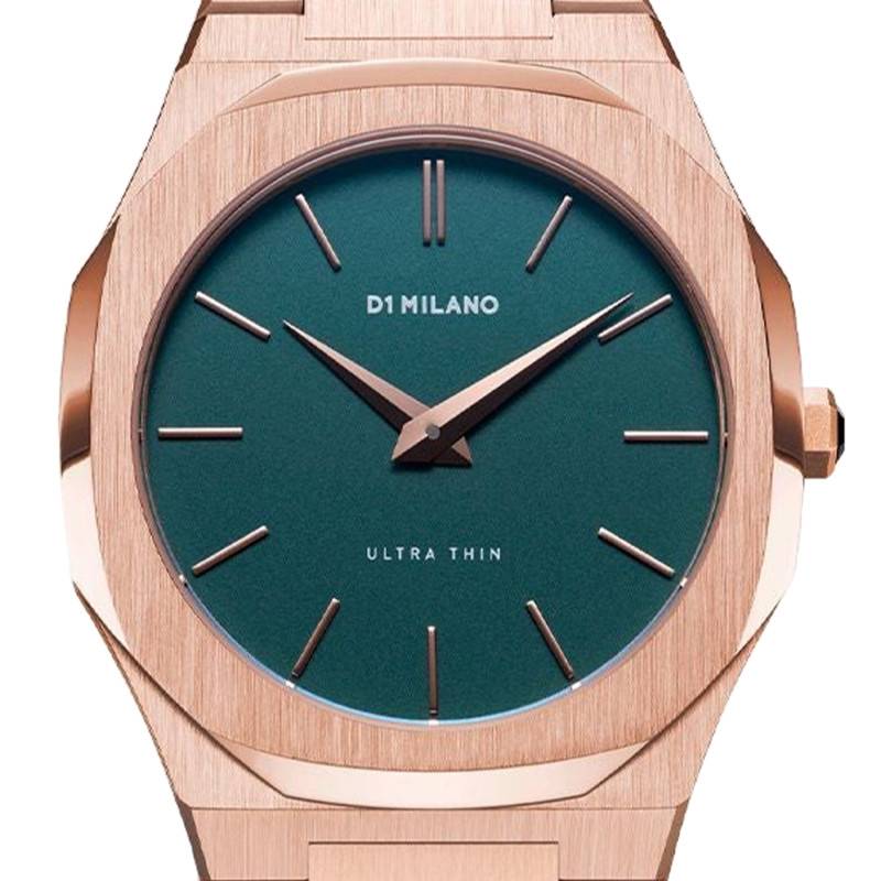 La maison italienne D1 Milano est une spécialiste des gardes-temps design et terriblement élégants. Depuis 2017, elle s'illustre grâce à sa collection ultra thin mettant en avant la finesse du modèle. Ici, elle vous propose sa version Forest, une magnifique montre arborant un boîtier en acier inoxydable PVD or rose brossé d'un diamètre de 38mm pour une épaisseur de 6mm, des dimensions pensées pour un poignet masculin. Il se dote d'un verre Saphir afin de le protéger des éventuels chocs et rayures. Sa couronne crantée prend place au niveau de l'index de trois heures afin de vous permettre de changer l'heure de votre modèle. Enfin, son fond de boîte maintenu par des vis affiche une étanchéité de 5 atmosphères.