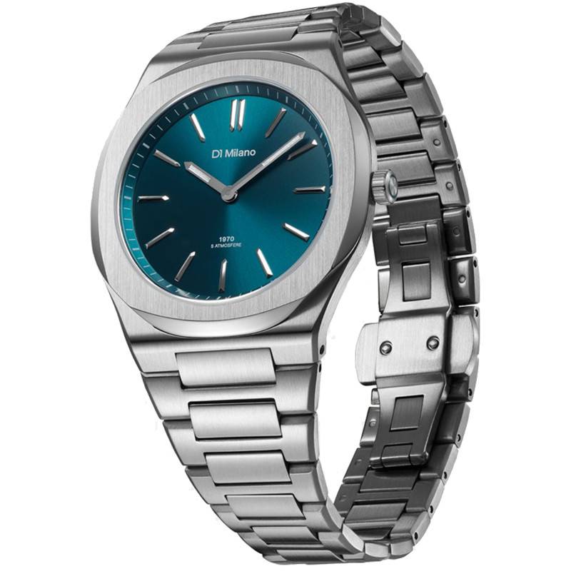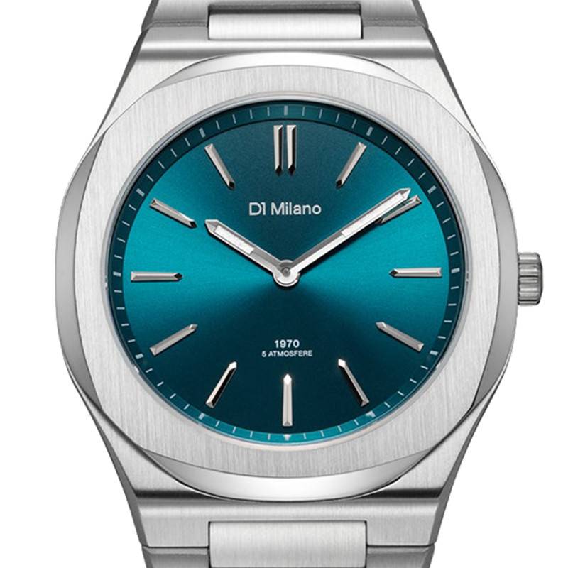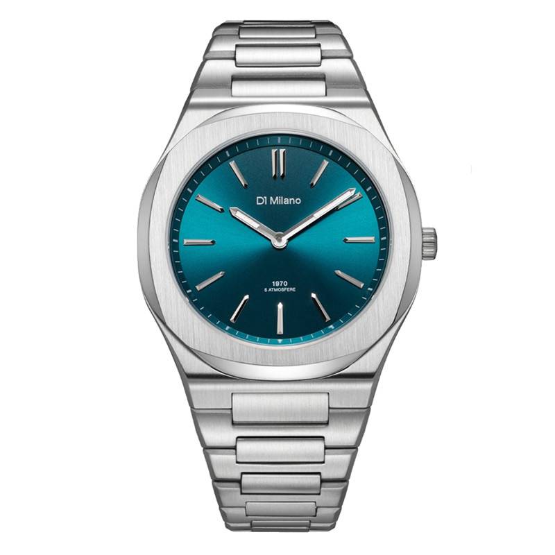 La montre D1 Milano Ultra Thin Groovy Green 39 mm se distingue par son design octogonal élégant, fabriqué en acier inoxydable 316L, matière réputée pour sa robustesse et sa résistance à la corrosion. Ce modèle affiche un poids de 104 grammes, conférant une sensation de solidité tout en demeurant agréable à porter au quotidien. La finition brossée et polie de l'acier met en valeur le style moderne et sophistiqué de cette pièce d'horlogerie. Le verre saphir, réputé pour sa dureté et son traitement antireflets, protège efficacement le cadran, permettant une lecture facile de l'heure en toute circonstance.