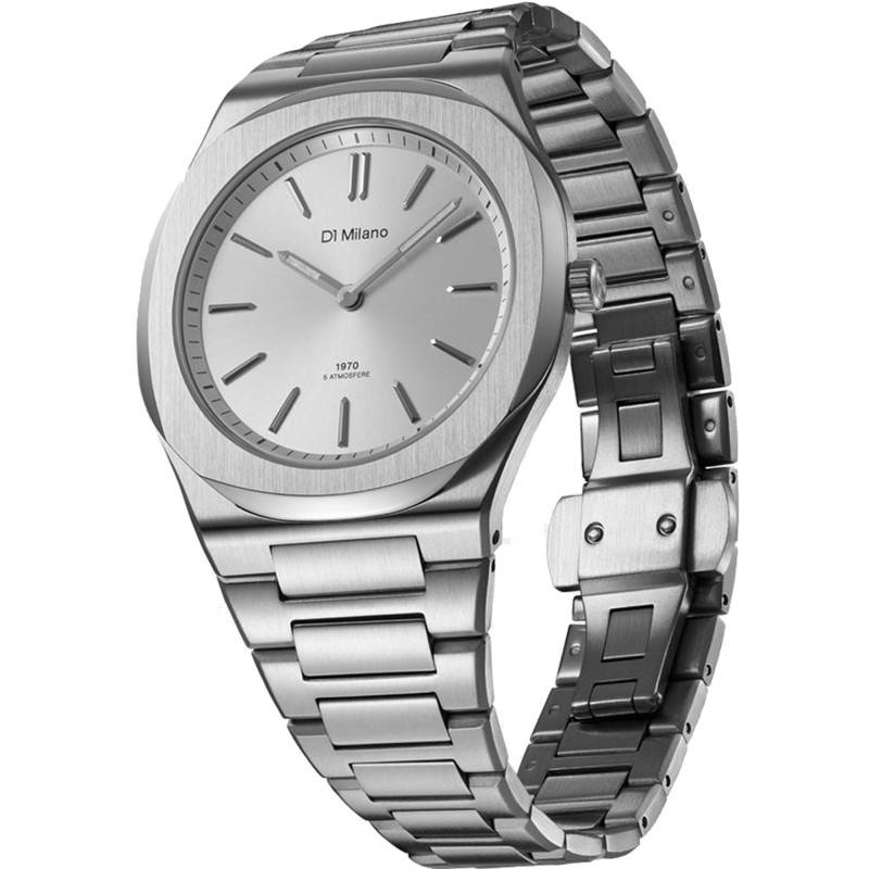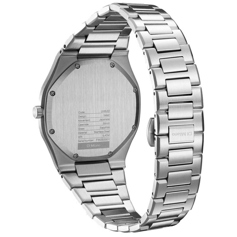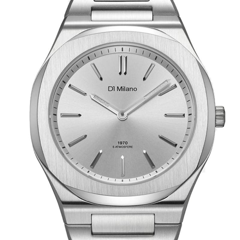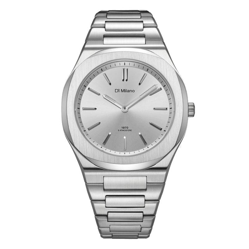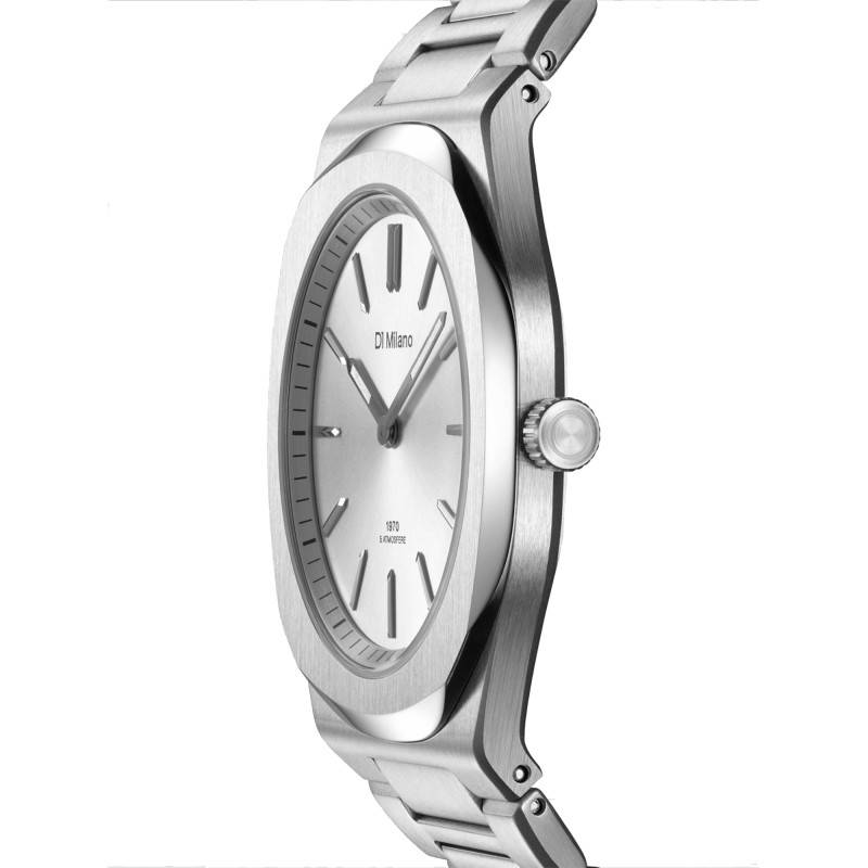 La montre D1 Milano Ultra Thin Groovy Silver est un modèle exceptionnel qui incarne le parfait équilibre entre style moderne et fonctionnalité avancée. Fabriqué en acier inoxydable 316L, ce garde-temps assure une robustesse à toute épreuve, tout en affichant une élégance sans pareille grâce à sa finition mate (brossée/satinée) et polie/brillante. Le boîtier octogonal de 39 mm de diamètre confère à cette montre une allure audacieuse et contemporaine, qui se démarque des modèles classiques. Avec un poids de 104 grammes, elle s'ajuste confortablement au poignet sans être encombrante. La montre est équipée d'un verre saphir plat avec un traitement antireflet, garantissant une visibilité claire et sans éblouissement dans toutes les conditions lumineuses.