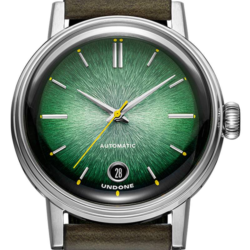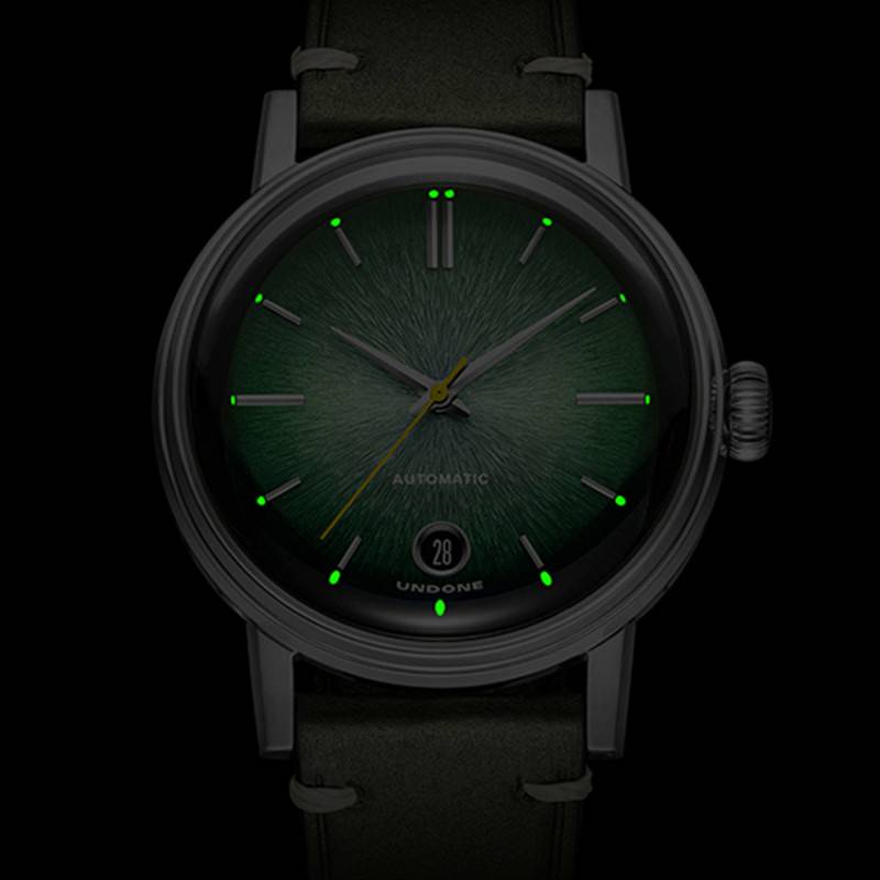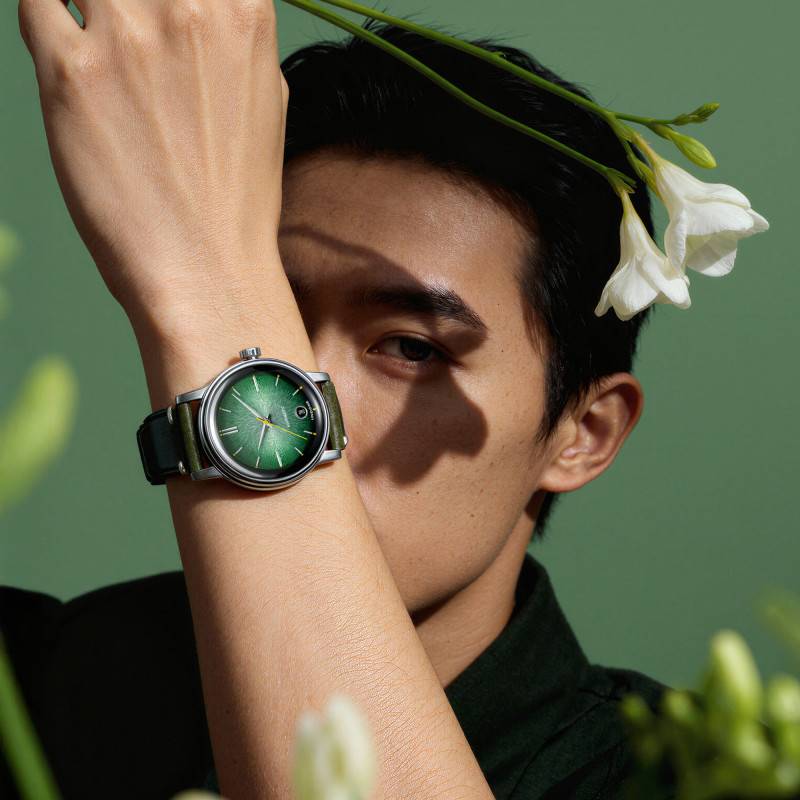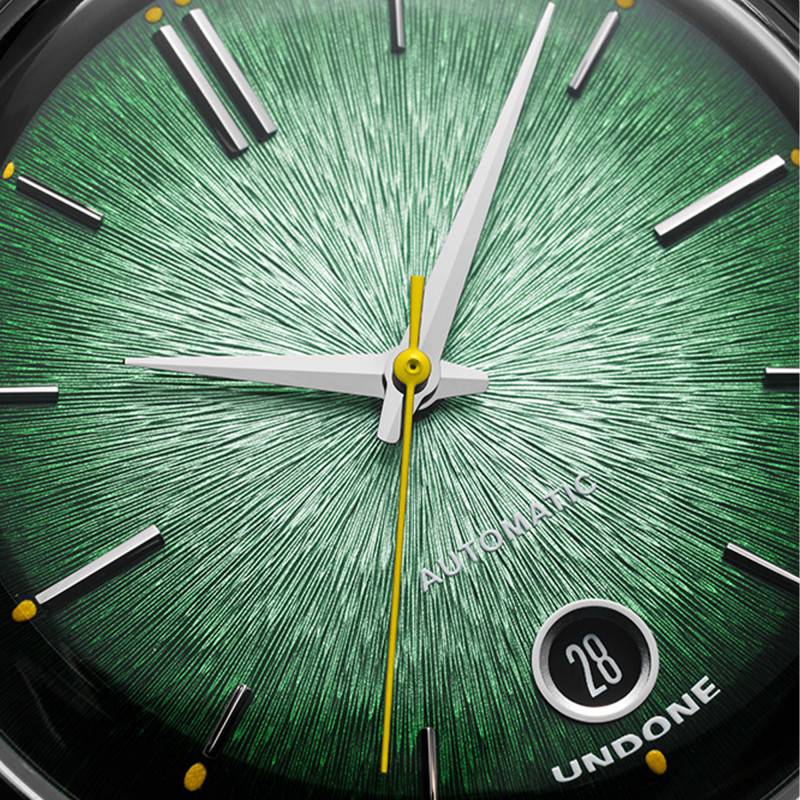 Le cadran de cette montre est une victoire de la tradition japonaise en émail. Forgé à 800°C puis poli à la main, il révèle un vert émail d'une profondeur et d'une brillance remarquables, rendant hommage à des techniques ancestrales d'une rare sophistication. Sa surface, polie, offre un jeu de lumière exceptionnel, créant des mouvements subtils du vert frais au vert profond selon l'éclairage. Les index luminescents verts se dressent avec élégance contre le fond émaillé, offrant une lecture claire et distincte de l'heure. Un guichet date discret est positionné à 6 heures, apportant fonctionnalité et équilibre au design.