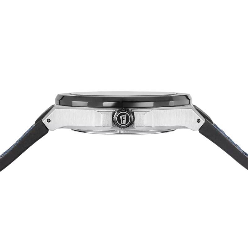 Le bracelet est intégralement conçu en cuir de bovin bleu de haute qualité, offrant flexibilité et confort inégalés. Ce matériau assure une texture douce et une longévité remarquable. Les surpiqûres visibles ajoutent un détail raffiné et sophistiqué, rehaussant l'élégance de l'ensemble. La fermeture à boucle ardillon permet un ajustement sûr et facile, complétant le look classique et établi de la montre.