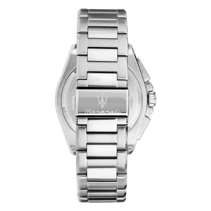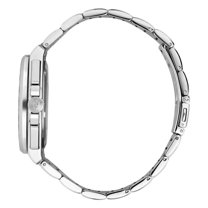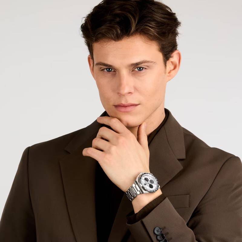 Le bracelet est réalisé en acier inoxydable, une matière choisie pour sa durabilité et son aspect moderne. La teinte gris argenté est complétée par des finitions brossées et polies qui ajoutent un relief et une esthétique raffinée au modèle. La largeur du bracelet participe à l'équilibre esthétique de l'ensemble de la montre, en épousant parfaitement les lignes du boîtier. Il est équipé d'une boucle déployante avec fermoir de sécurité, assurant un confort optimal tout en sécurisant le port du garde-temps sur le poignet.