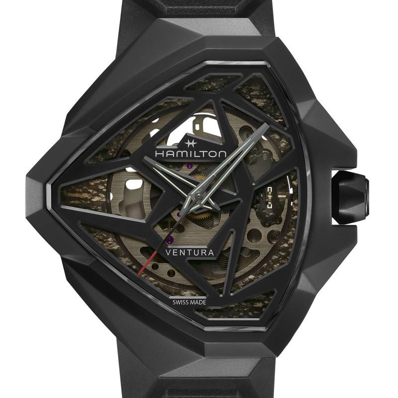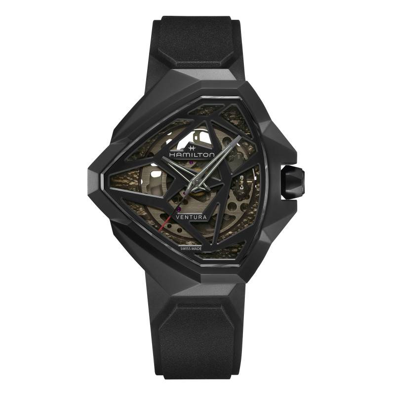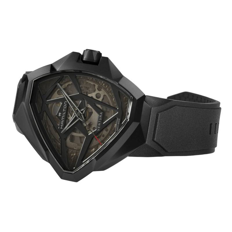 La montre Hamilton Ventura Edge Skeleton incarne une fusion entre une esthétique futuriste et une robustesse technique irréprochable. Avec son boîtier en acier inoxydable revêtu d'un PVD noir, elle affiche une allure résolument moderne. Sa forme triangulaire unique, imposante avec une longueur de 51 mm et une largeur de 47 mm, est accentuée par une épaisseur de 13,80 mm, conférant à cette pièce horlogère une présence affirmée sur le poignet masculin. La montre est fabriquée en Suisse, maîtrise des techniques horlogères de haut niveau, comme en témoigne aussi son fond de boîte maintenu par des vis et transparent, permettant d'admirer le spectacle interne du mécanisme. Le verre saphir de la montre, renommé pour sa résistance, est bombé et traité antireflets, assurant non seulement une protection optimale contre les rayures mais également une lecture claire à tout moment.